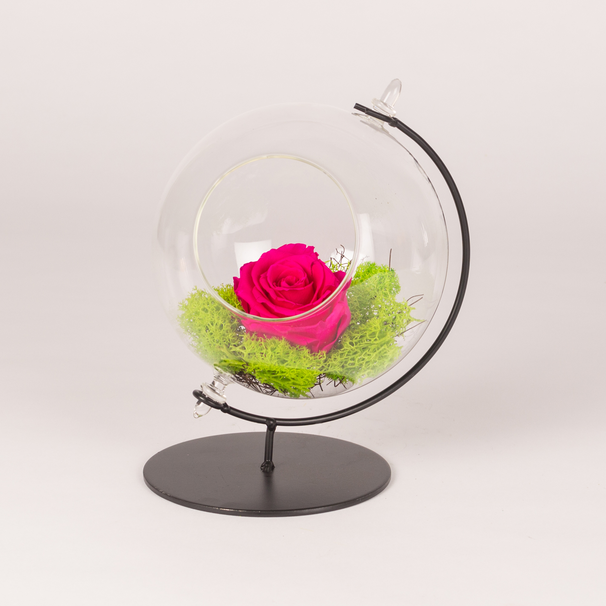 Glass globe d16cm h20cm with pink preserved rose, green moss and small nest.