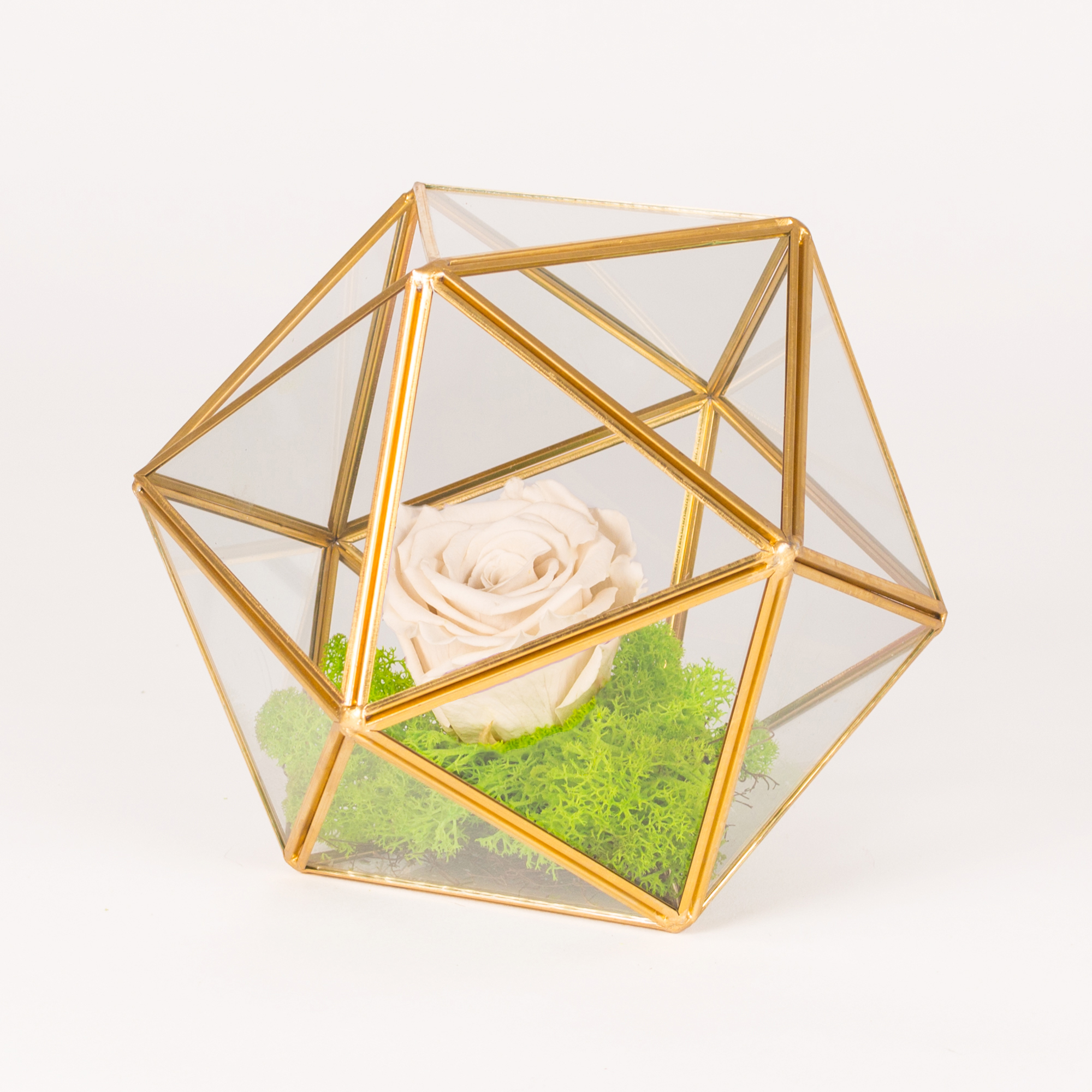 Prism sphere diam20cm with white preserved rose, green moss and small nest.