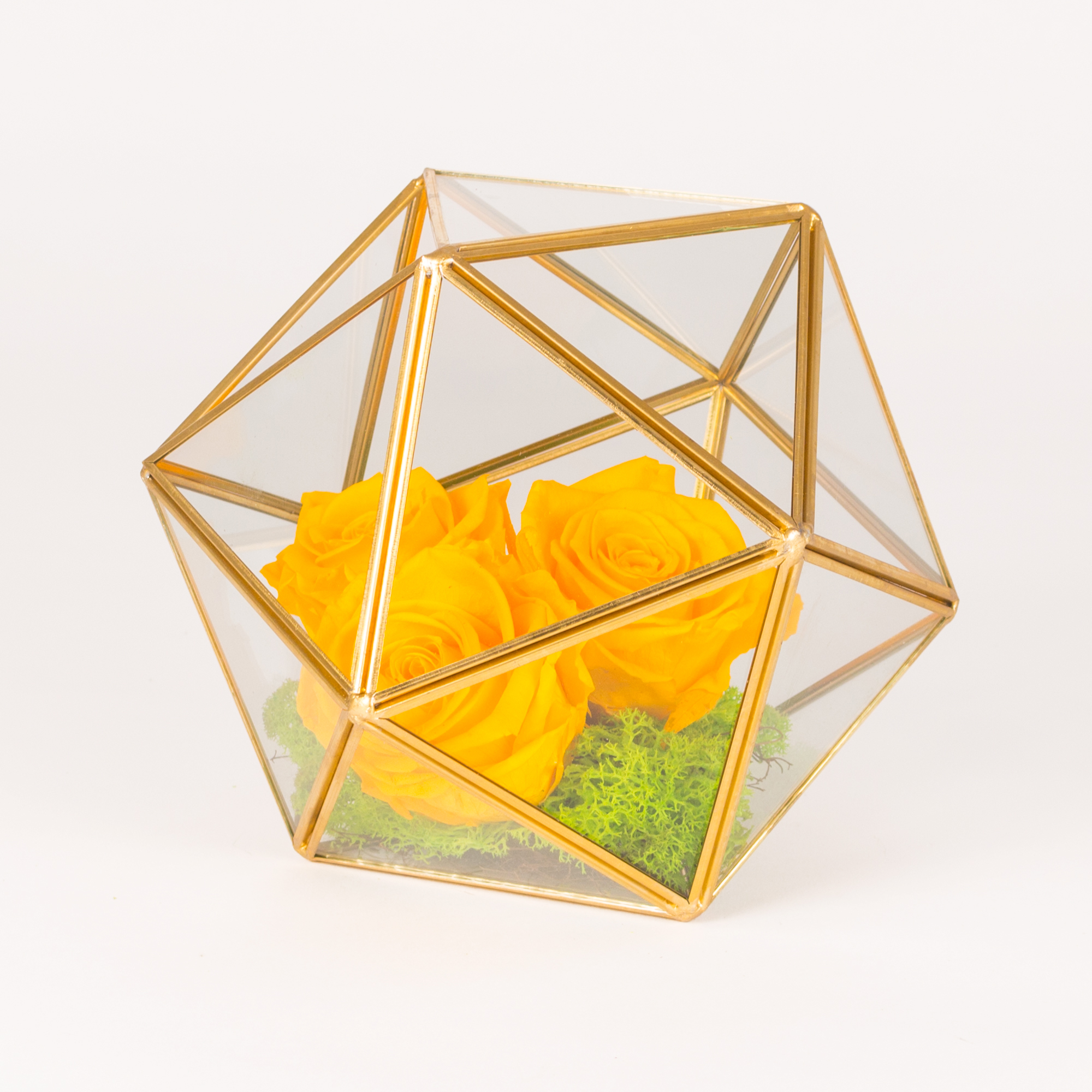 Prism sphere diam 20cm with 3 preserved yellow roses, green moss and small nest.