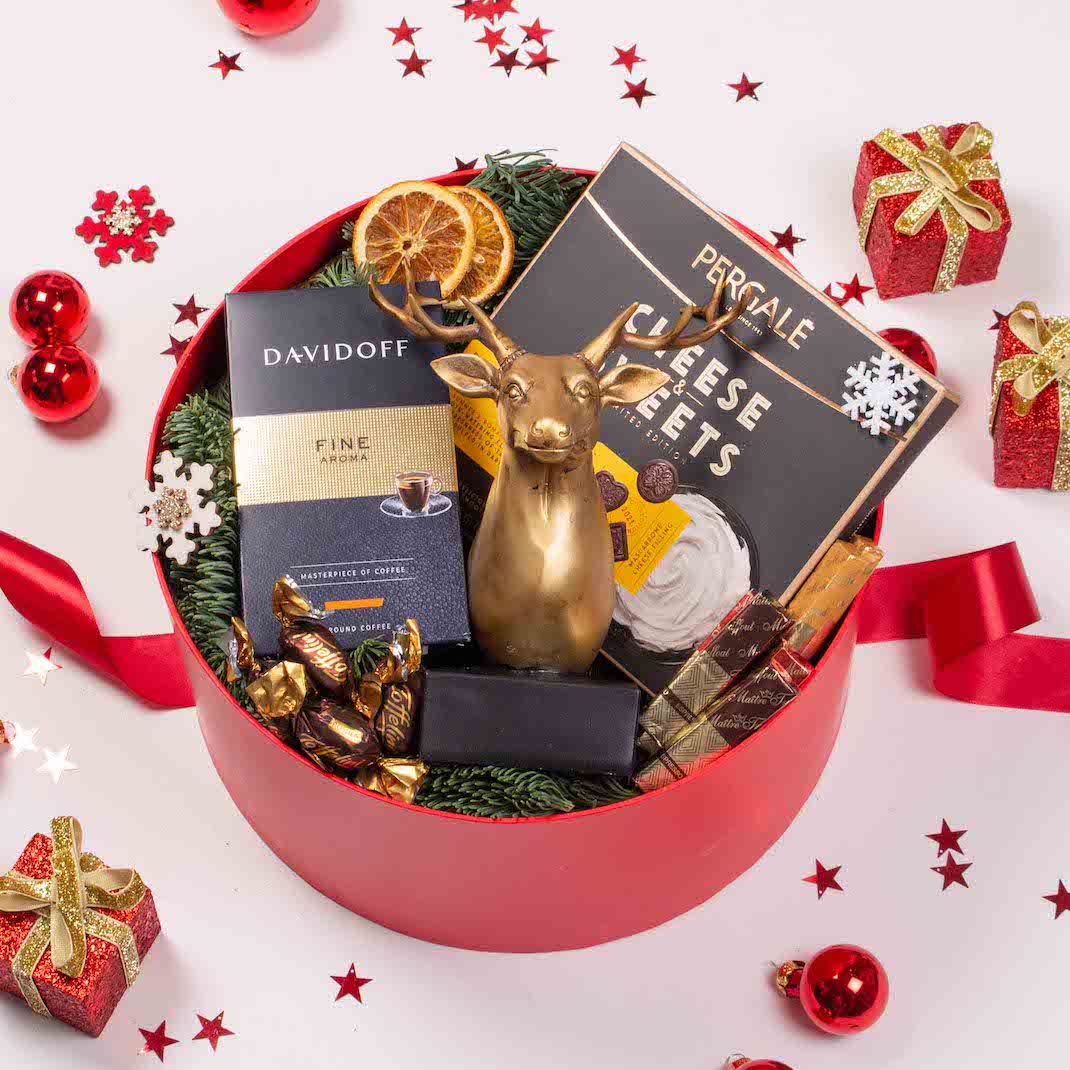 The most special occasions need appropriate gifts. Turn an anniversary into a beautiful memory with this gift basket with sweets , coffee and other decorations. A gourmet gift basket or a corporate gift basket is a simple and beautiful way to show gratitude, or to congratulate someone. We have chosen quality products, so that our relatives, colleagues or business partners have a beautiful surprise. Romanian traditional artisanal cozonac with cocoa and walnut, or better, the one with Romanian Brandy syrup from Zexe Braserie (finger licking good, we promise!), Panettone Gran Ducale with raisins , Romanian artisanal sponge cake with chocolate and oranges also from Zexe Braserie, delicious pasta and well-chosen sauces, Parmigiano Reggiano , gingerbread, chocolate pralines, appetizing cookies with butter and of course refined wines (Le Versant Cabernet Sauvignon , Wine Crime Rose , Cabernet Suvignon Cricova Vintage Collection, Chardonnay Cricova Vintage Collection) but also Prosecco and Moet champagne. Add a personalized message and we immediately leave to do what we know best, that is to deliver emotions.