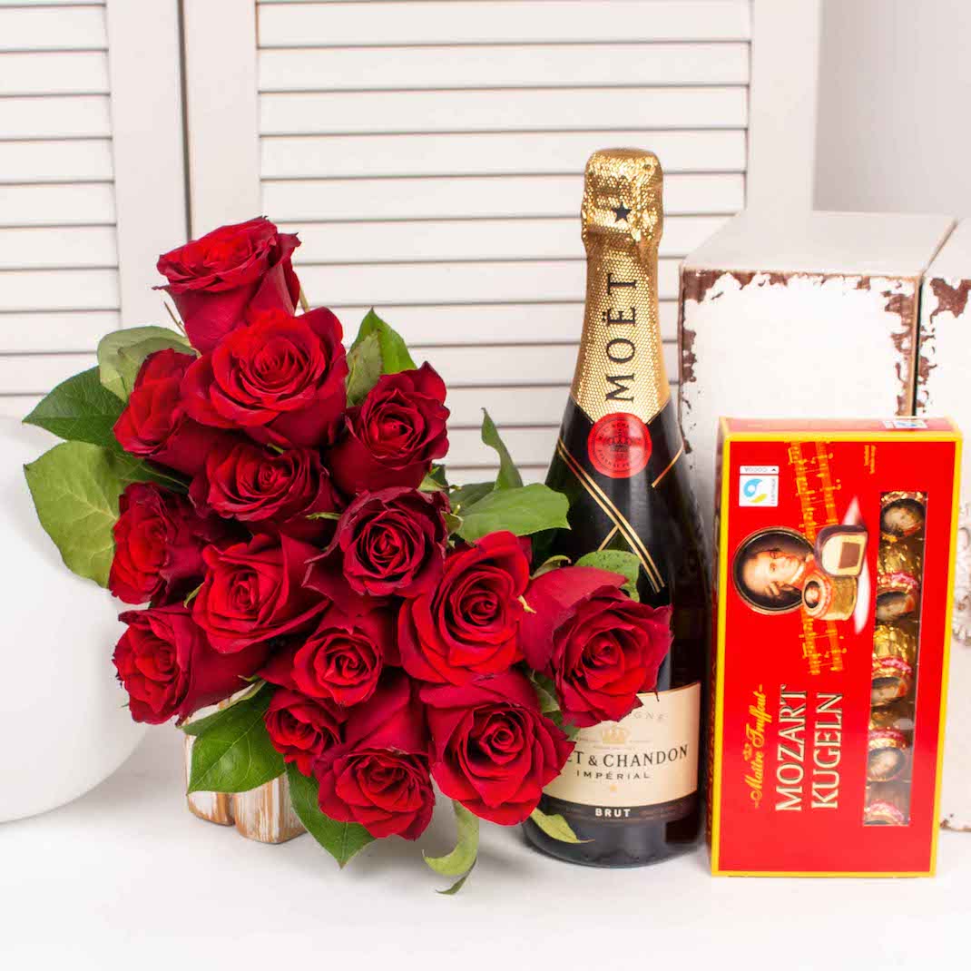 It contains chocolate pralines with marzipan, Moet champagne, 15 red roses and decorative greenery