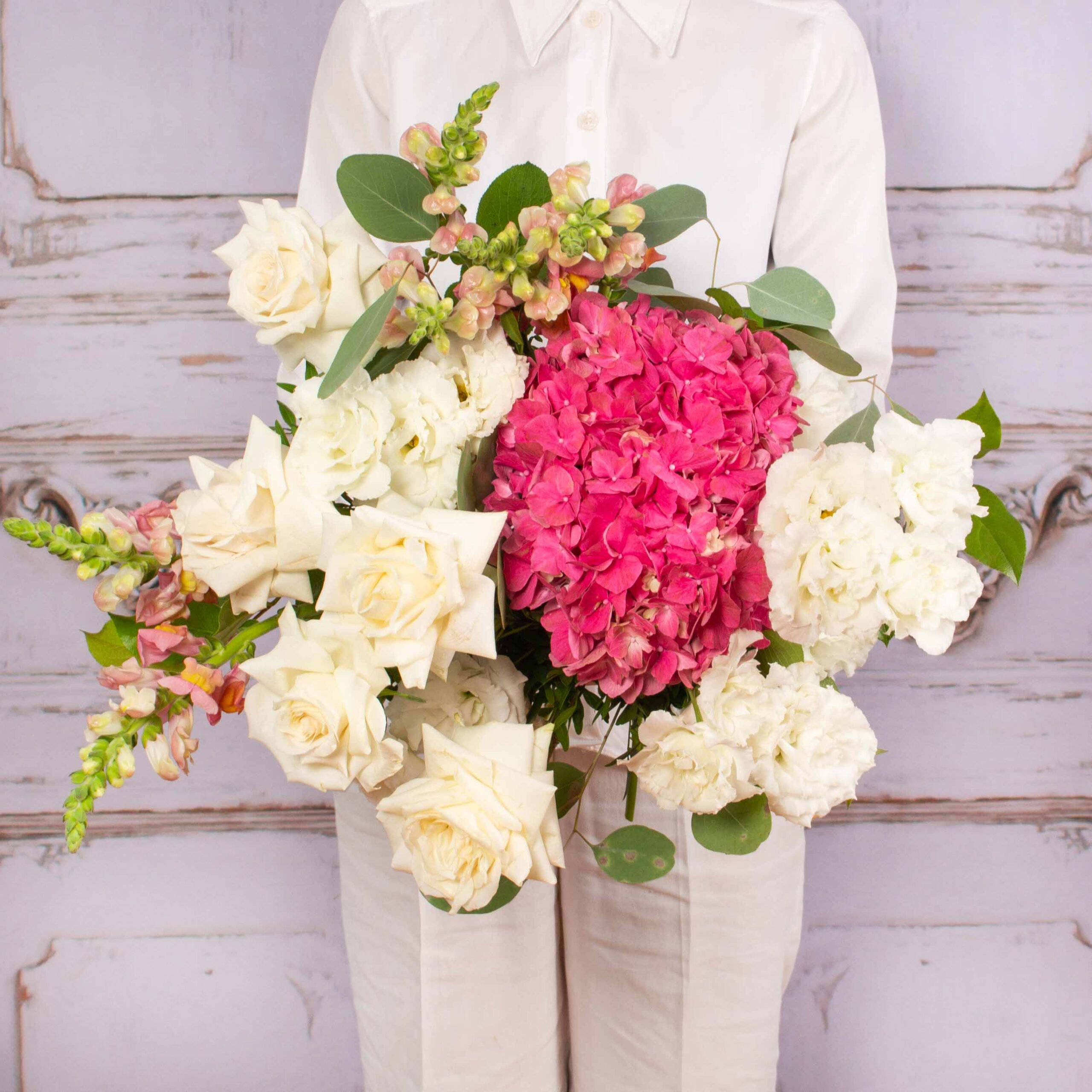Bouquet with 2 pink hydrangea, 5 white roses, 3 white lisianthus, greenery and other decorative flowers.
