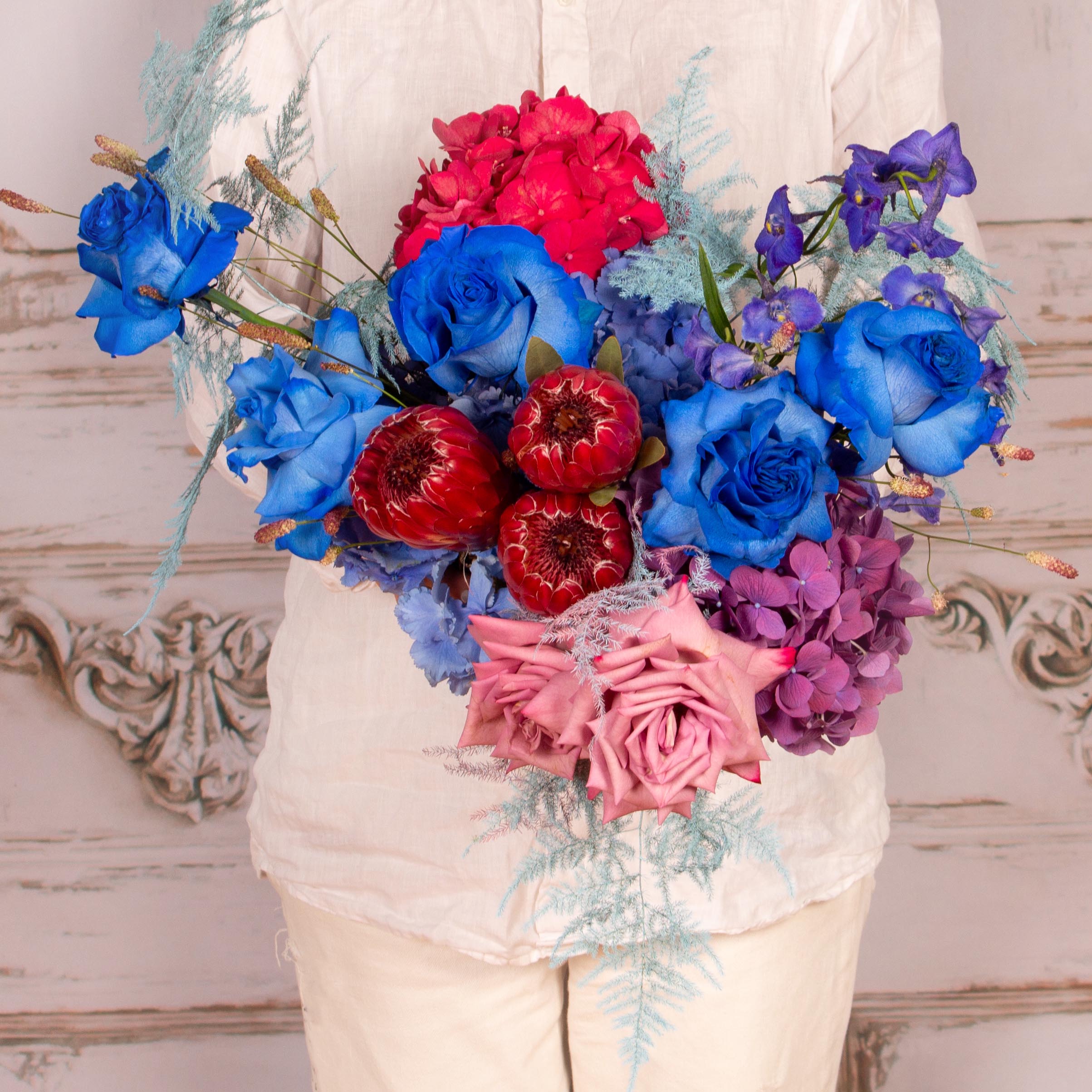 Bouquet with 5 blue roses, 3 protea, 2 pink roses, blue hydrangea, purple hydrangea, 2 blue delphinium, greenery and other decoration.