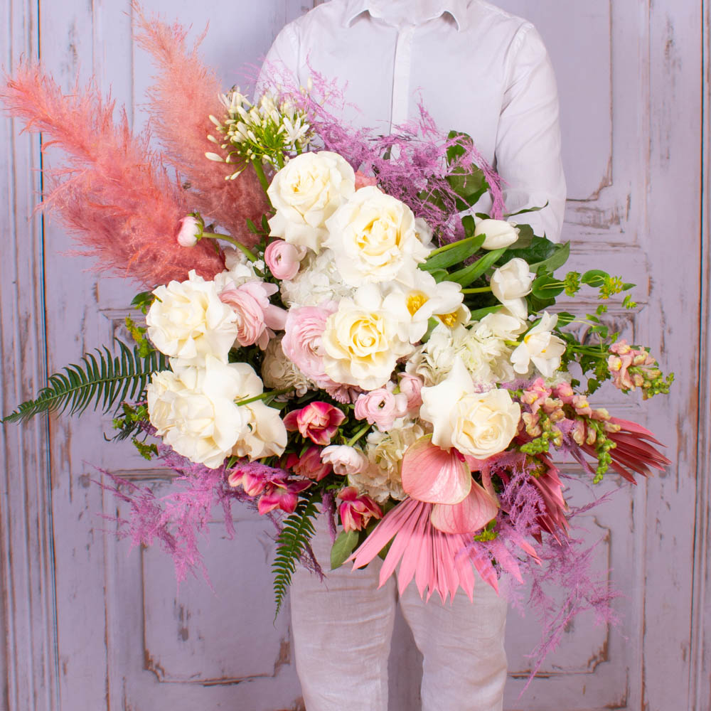 Spring bouquet with 3 white hydrangea, 8 roses, 6 ranunculus, 3 white agapanthus, 6 pink tulips, greenery and other decorative flowers.