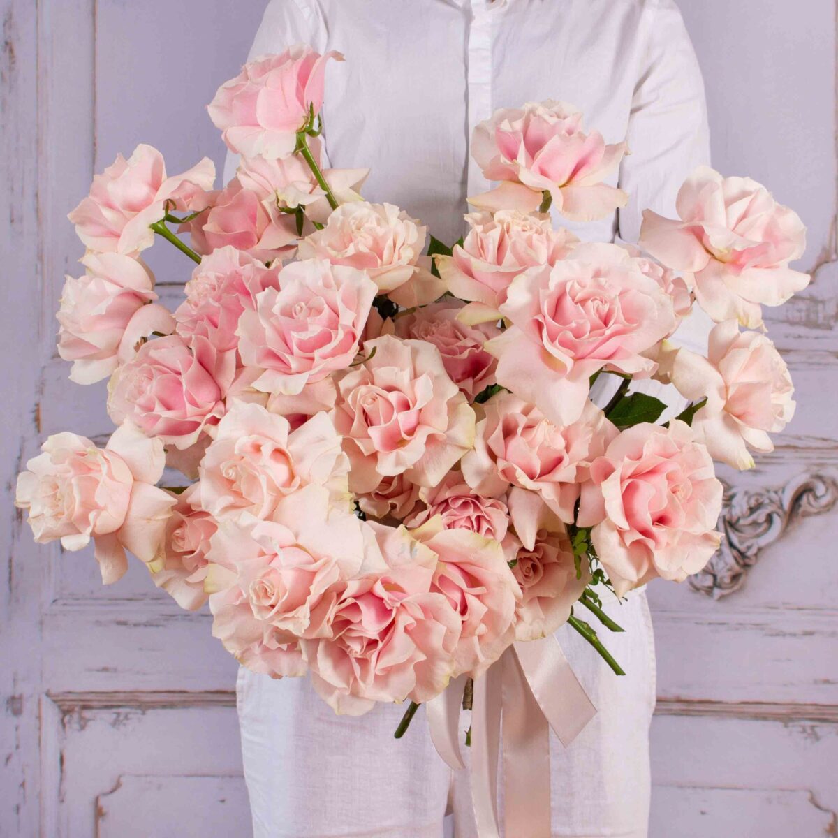 Flowers bring happiness to the people. This Bouquet of 35 pink pale roses will be a beautiful surprise to anyone. For sure this bouquet made by our florists at the Purple Flowers online Flower Shop can transform a regular day into a memorable one. Add your special message to the flowers and we will deliver it as soon as possible. There is no better way of saying „I love you!”, „Happy Birthday!” or „Congratulations!” than with a bouquet of flowers.