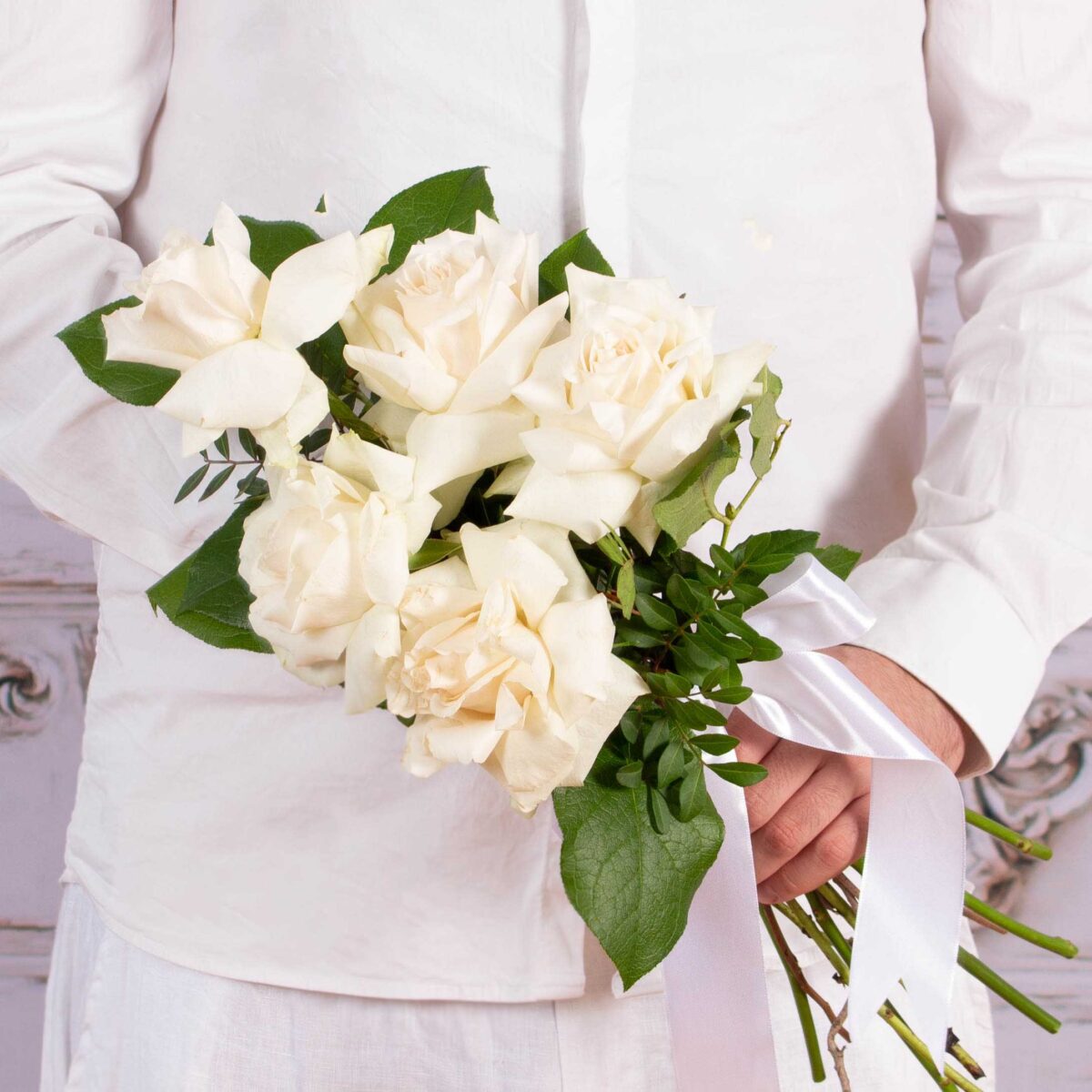 Flowers bring happiness to the people. This Bouquet of 5 white roses will be a beautiful surprise to anyone. For sure this bouquet made by our florists at the Purple Flowers online Flower Shop can transform a regular day into a memorable one. Add your special message to the flowers and we will deliver it as soon as possible. There is no better way of saying „I love you!”, „Happy Birthday!” or „Congratulations!” than with a bouquet of flowers.