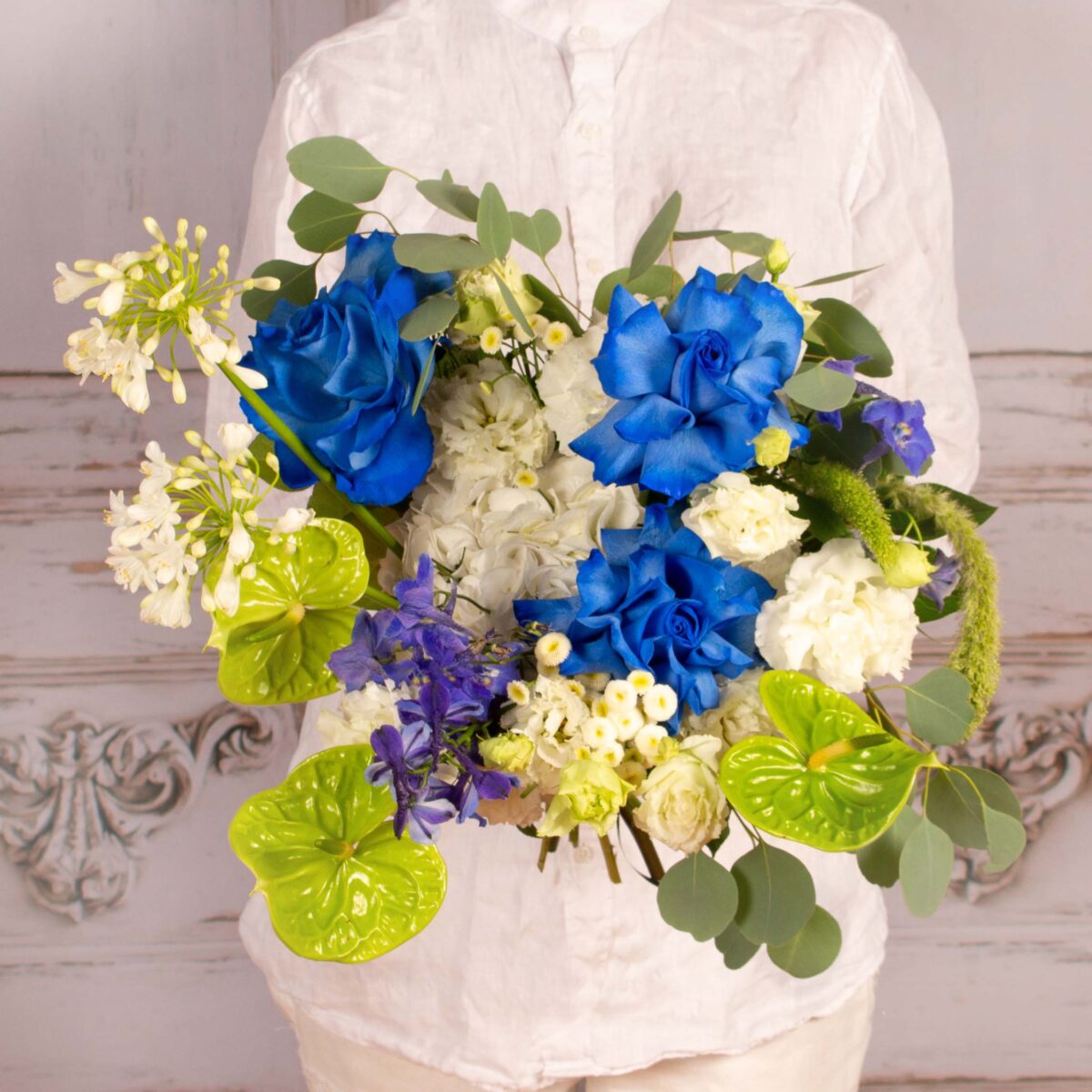 Bouquet with 3 blue roses, 4 white lisianthus, 3 blue delphinium, blue hydrangea, 3 green anthurium, greenery and other decorative flowers.