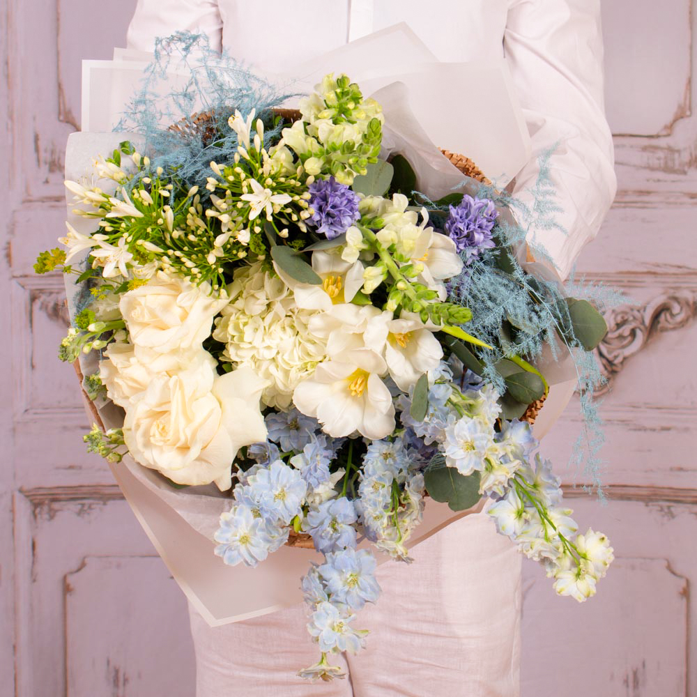 Bouquet with white hydrangea, 3 white roses, 4 blue delphinium, 3 white agapanthus, greenery and other decorative flowers.