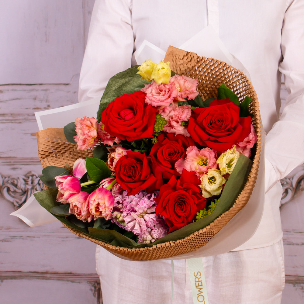 Bouquet with 5 red roses, 3 pink lisianthus, 5 columbus tulips, 3 pink hyacinths, greenery and other decorative flowers.