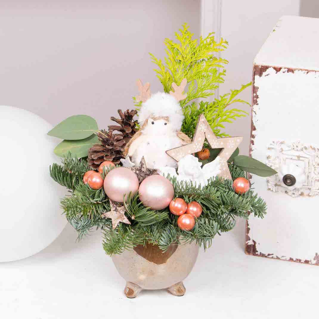 Christmas is the most beautiful time of the year and reminds us of childhood. We all like to give and receive beautiful presents. And for sure we love to make our beloved ones happy. This Christmas arrangement with natural fir , figurines and globes is the perfect gift to surprise our friends and family. We need to add only a cup of hot tea, carols and maybe a fireplace. Inspired by this jolly picture we created all these beautiful Christmas arrangements.