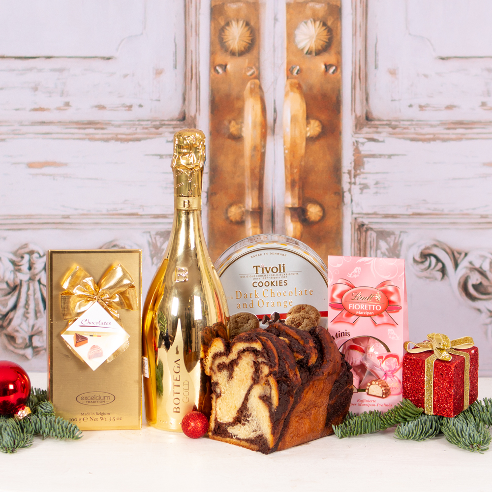 The most special occasions need appropriate gifts. Turn an anniversary into a beautiful memory with this gift basket with Sweets and Rose Wine . A gourmet gift basket or a corporate gift basket is a simple and beautiful way to show gratitude, or to congratulate someone. We have chosen quality products, so that our relatives, colleagues or business partners have a beautiful surprise. Romanian traditional artisanal cozonac with cocoa and walnut, or better, the one with Romanian Brandy syrup from Zexe Braserie (finger licking good, we promise!), Panettone Gran Ducale with raisins , Romanian artisanal sponge cake with chocolate and oranges also from Zexe Braserie, delicious pasta and well-chosen sauces, Parmigiano Reggiano , gingerbread, chocolate pralines, appetizing cookies with butter and of course refined wines (Le Versant Cabernet Sauvignon , Wine Crime Rose , Cabernet Suvignon Cricova Vintage Collection, Chardonnay Cricova Vintage Collection) but also Prosecco and Moet champagne. Add a personalized message and we immediately leave to do what we know best, that is to deliver emotions.