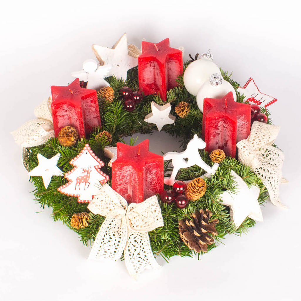 Christmas reminds us of childhood. The most beautiful moment is when we make presents, the one in which we offer smiles to our loved ones. The Christmas wreaths with stars, globes, cinnamon and dried orange slices bring the magic of Christmas around us. Inspired by the beauty of the winter holidays we created this arrangement.Add a custom message and give it to a loved one right now.