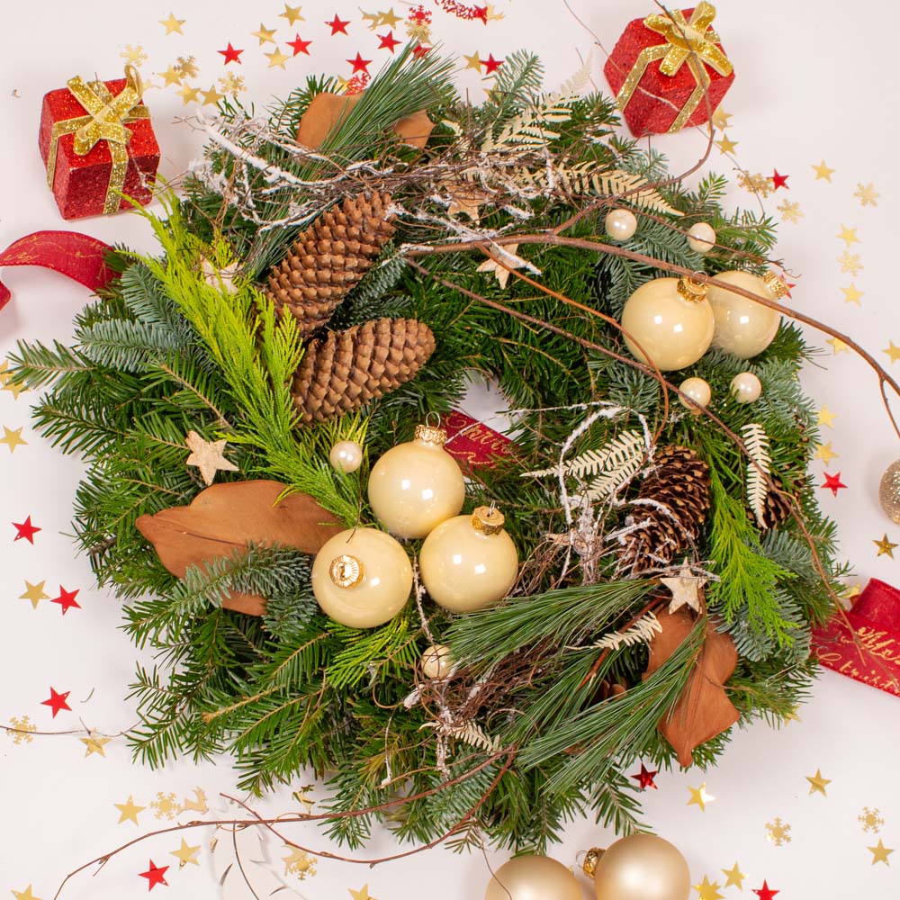 The wreath from the picture (some decorations may be slightly different) in a gift box with a bow