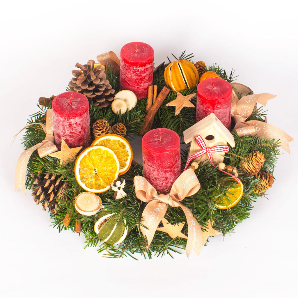 Christmas reminds us of childhood. The most beautiful moment is when we make presents, the one in which we offer smiles to our loved ones. The Christmas wreaths with stars, globes, cinnamon and dried orange slices bring the magic of Christmas around us. Inspired by the beauty of the winter holidays we created this arrangement.Add a custom message and give it to a loved one right now.