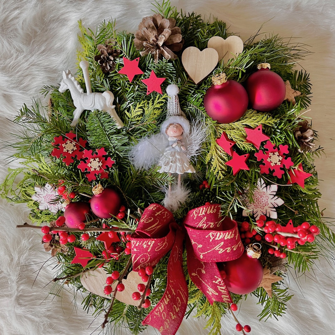 The wreath from the picture (some decorations may be slightly different) in a gift box with a bow