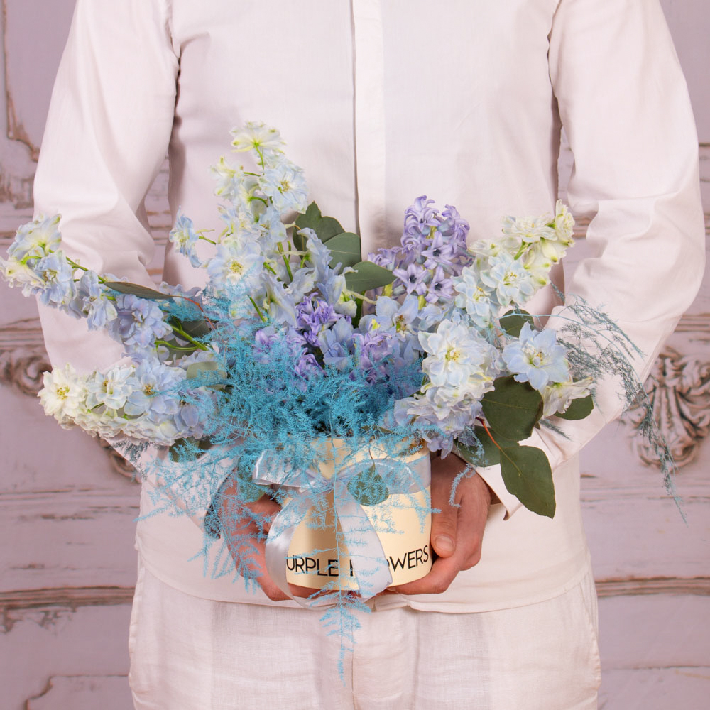 Express your feelings in flowers and offer this box with delphinium, hyacinths and other flowers to your loved one. These flowers will brighten the day of your wife, mother, girlfriend, colleague or boss! Add your personalised message and we’ll start surprising her right away with this special arrangement.