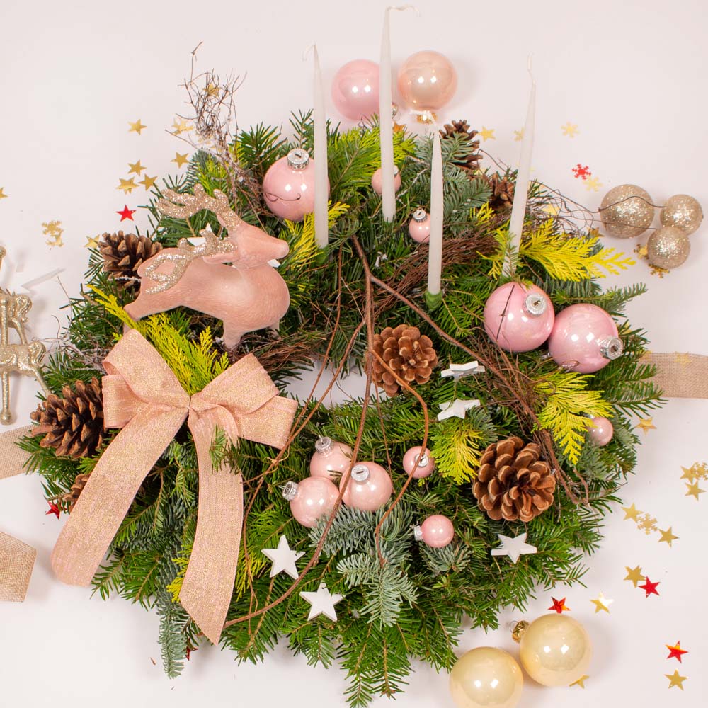 Door wreath with white candels and pink globes