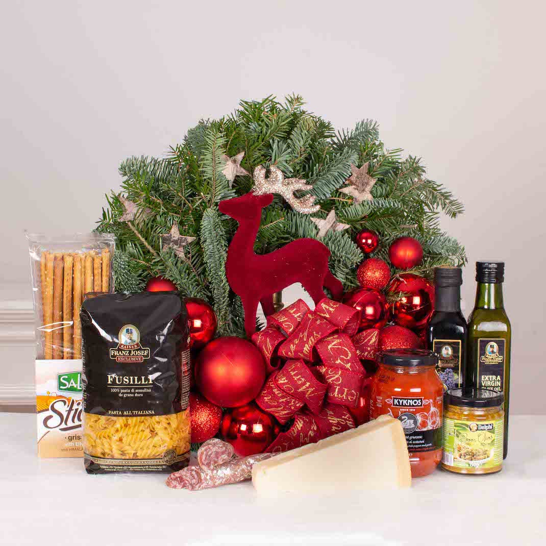 The most special occasions need appropriate gifts. Turn an anniversary into a beautiful memory with this gift basket with Christmas wreath with red globes, pastas, sauce, air-dried catalan specialty, parmesan, grissini, olives oil. A gourmet hamper or a corporate hamper is a simple and beautiful way to show gratitude or to congratulate someone.