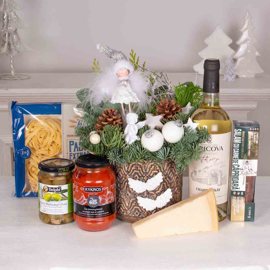 The most special occasions need appropriate gifts. Turn an anniversary into a beautiful memory with this gift basket with Christmas arrangement with little girl figurine and angel, white wine, pasta, sauce, green olives and parmesan. A gourmet hamper or a corporate hamper is a simple and beautiful way to show gratitude or to congratulate someone.