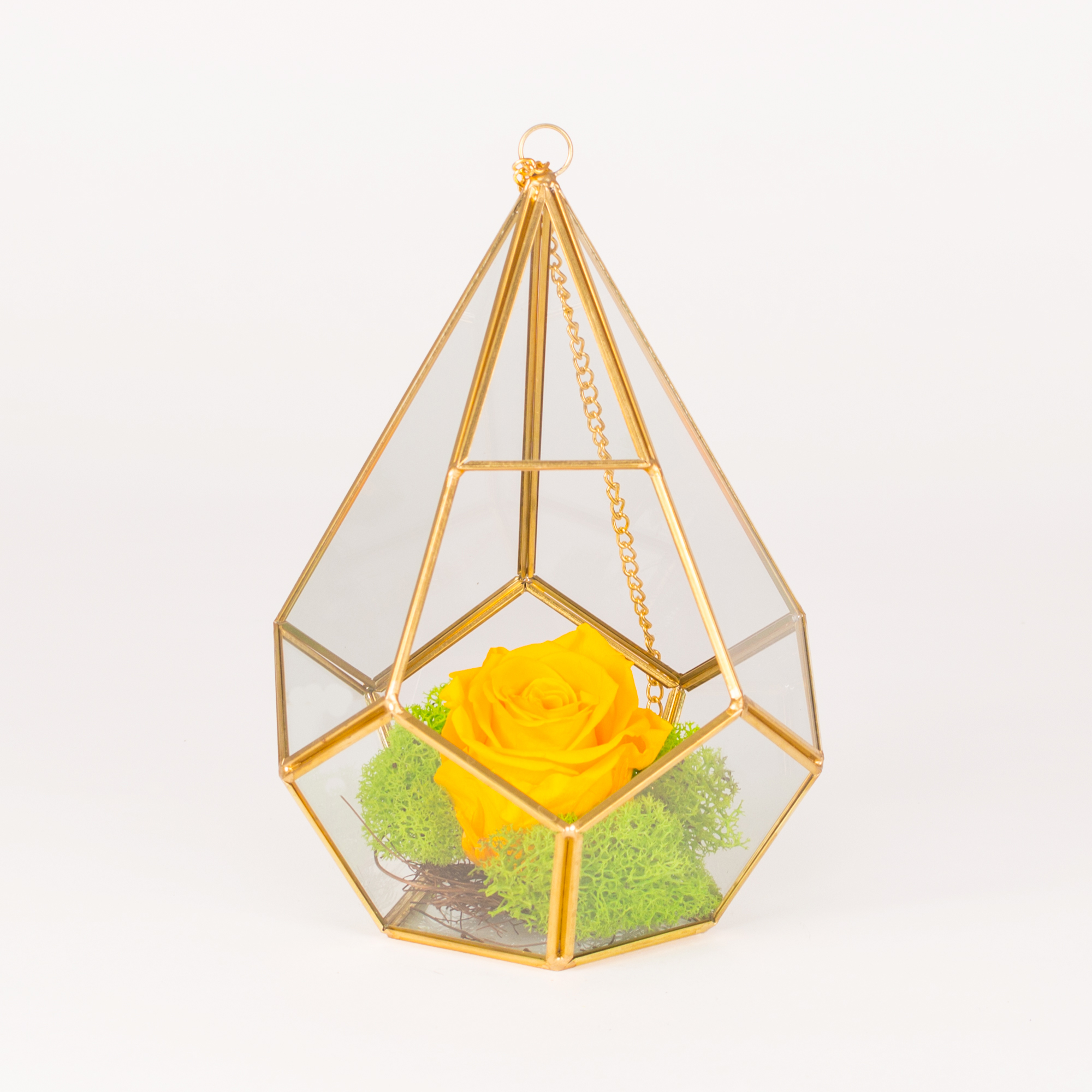 Diamond prism L15cm h23cm with preserved yellow rose, green moss and small nest.