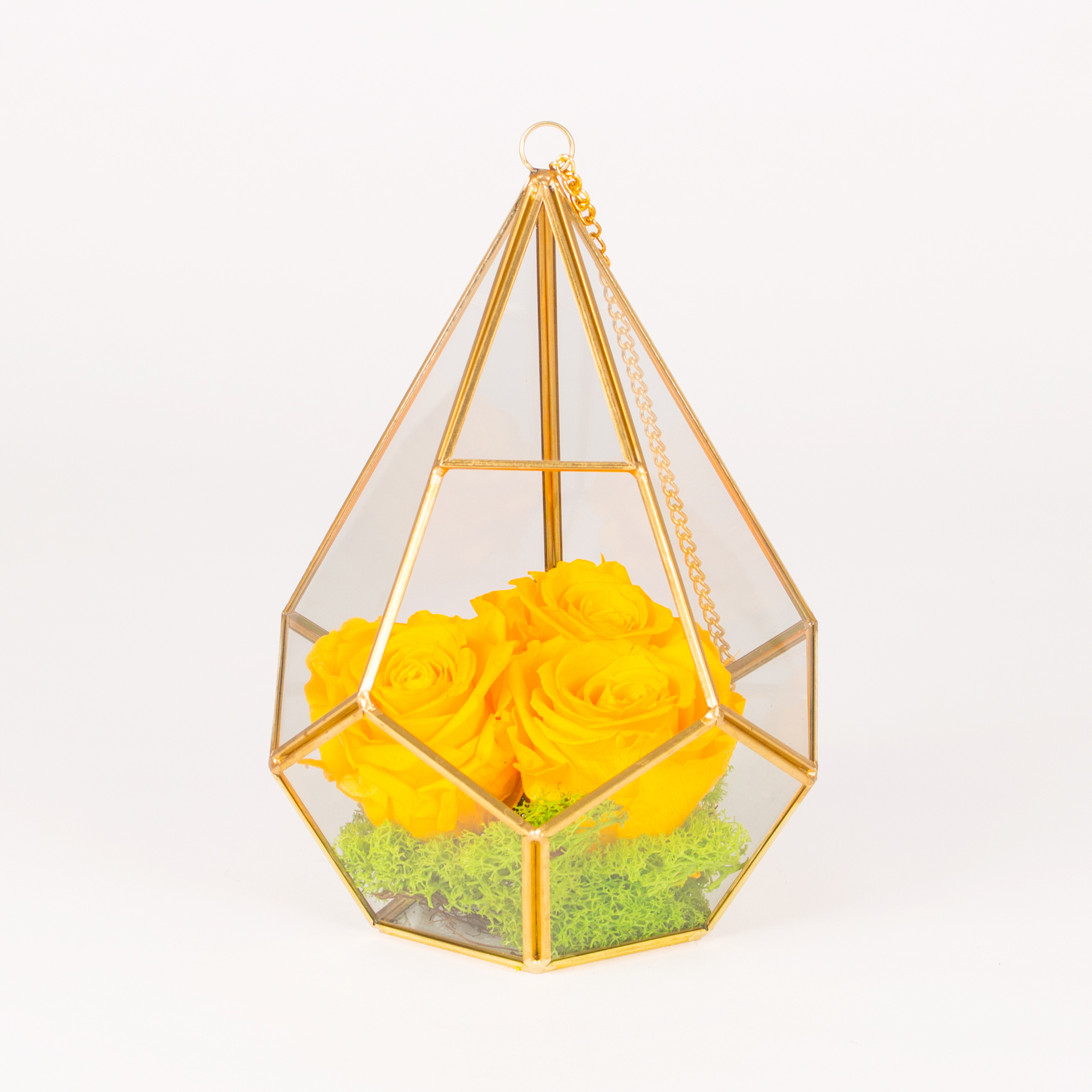 Diamond prism L15cm h23cm with 3 preserved yellow roses, green moss and small nest.