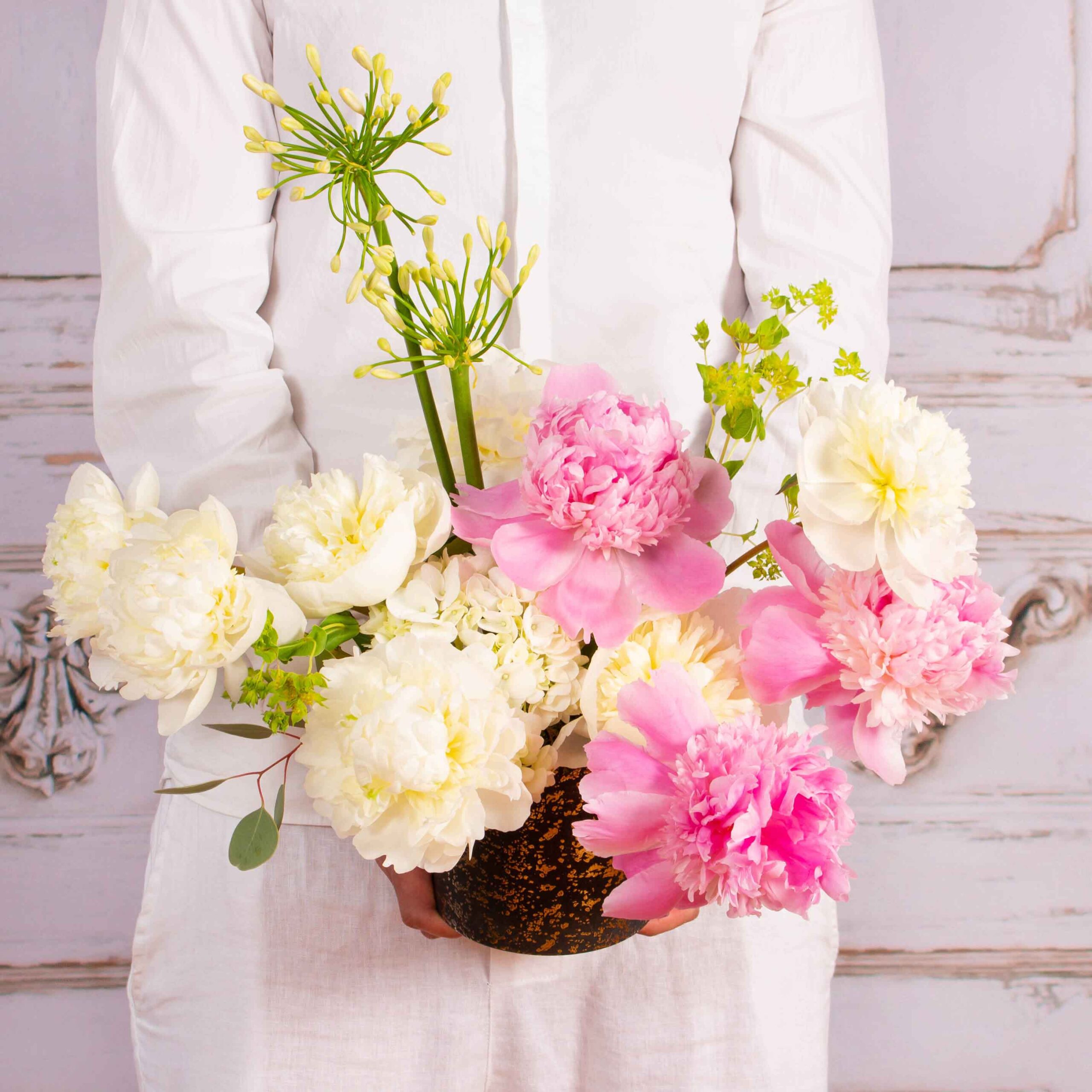 Ceramic vase with 7 white peonies, 3 pink peonies, hydrangea, greenery and other decorative flowers.