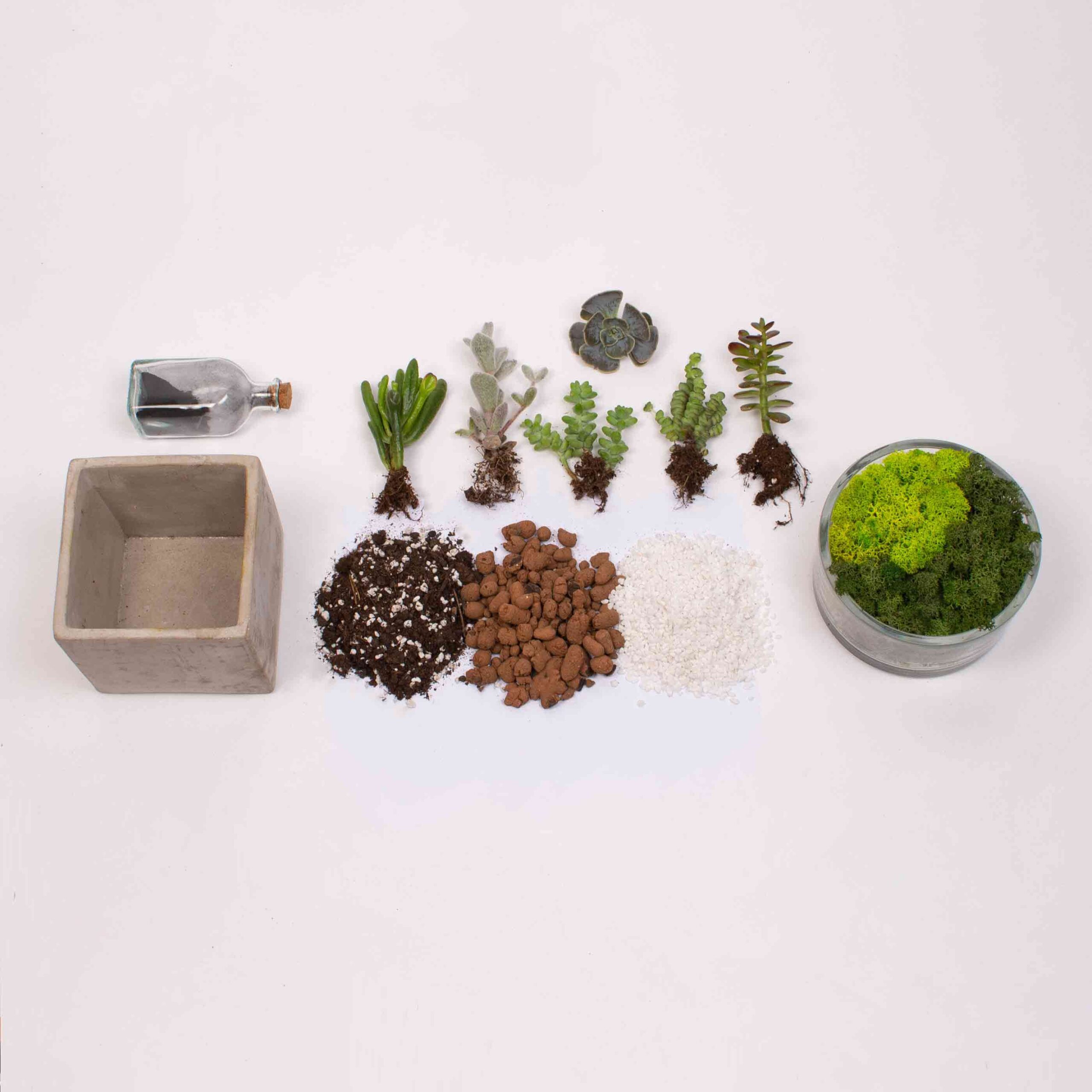 Cubic vase, preserved moss, 6 succulent plants, decorative stones, activated charcoal, ceramic stones and soil.