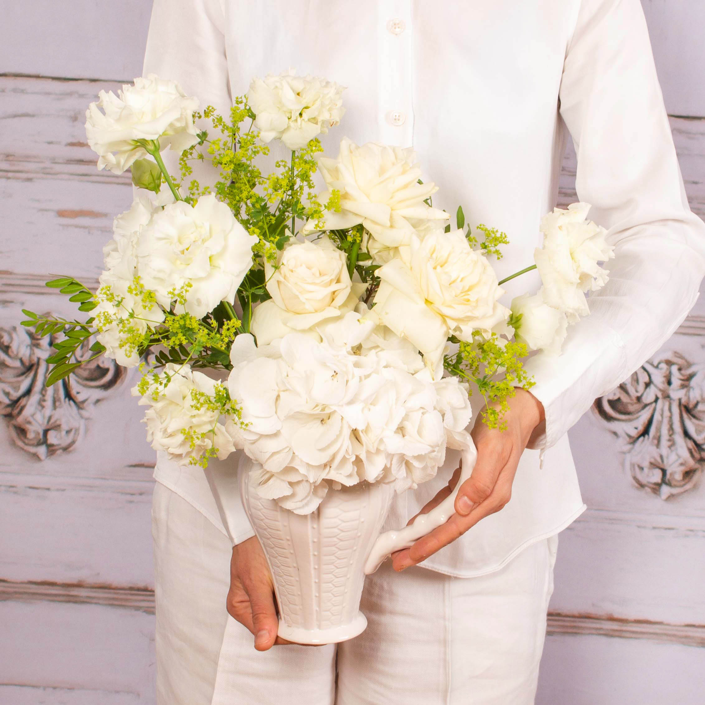Arrangement in ceramic vase with white hydrangea, 5 white roses, 2 white lisianthus, greenery and other decorative flowers.