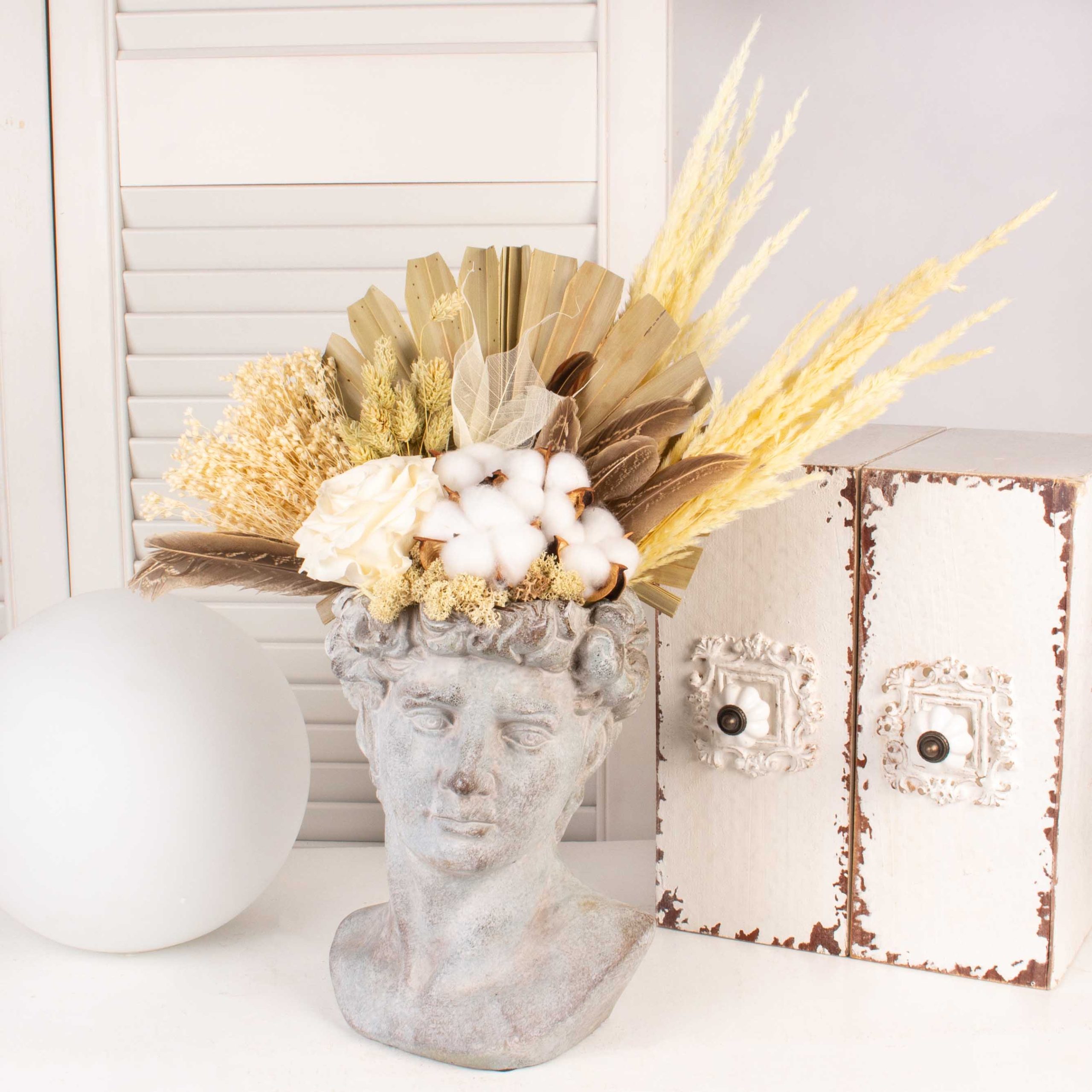 Antique vase with natural preserved palm, white preserved rose, 8 cotton cups and other decorative flowers.