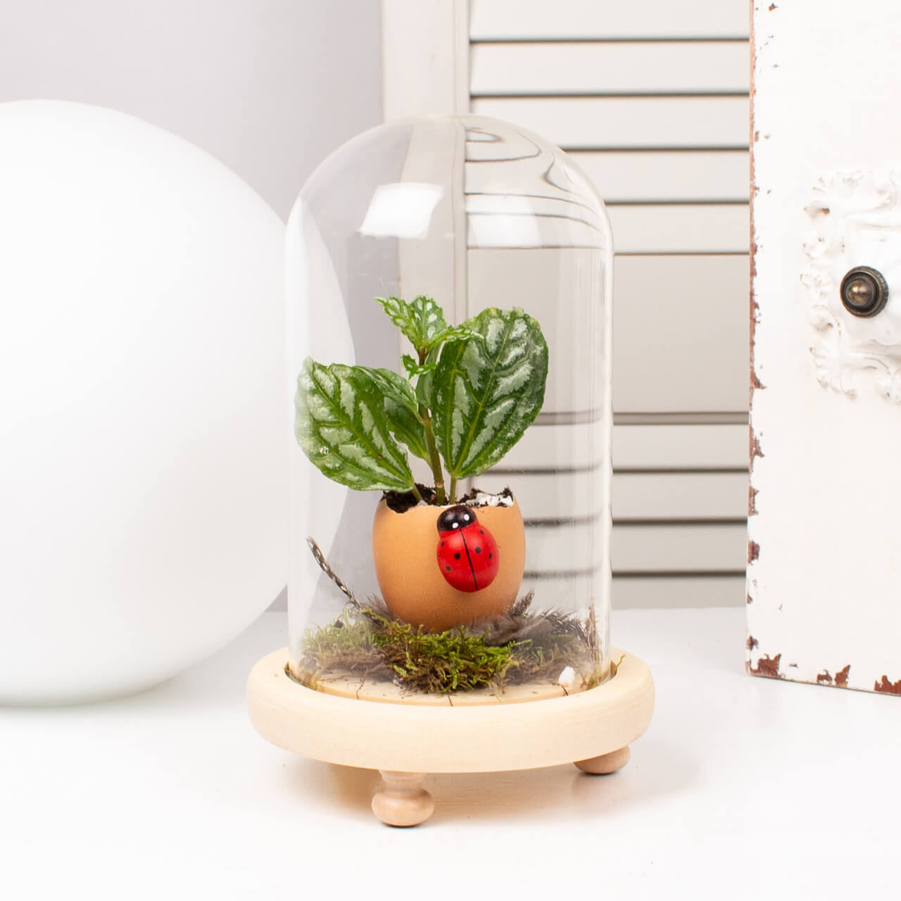 Arrangement in glass bell h20cm with wooden base, plant and other decorative elements.