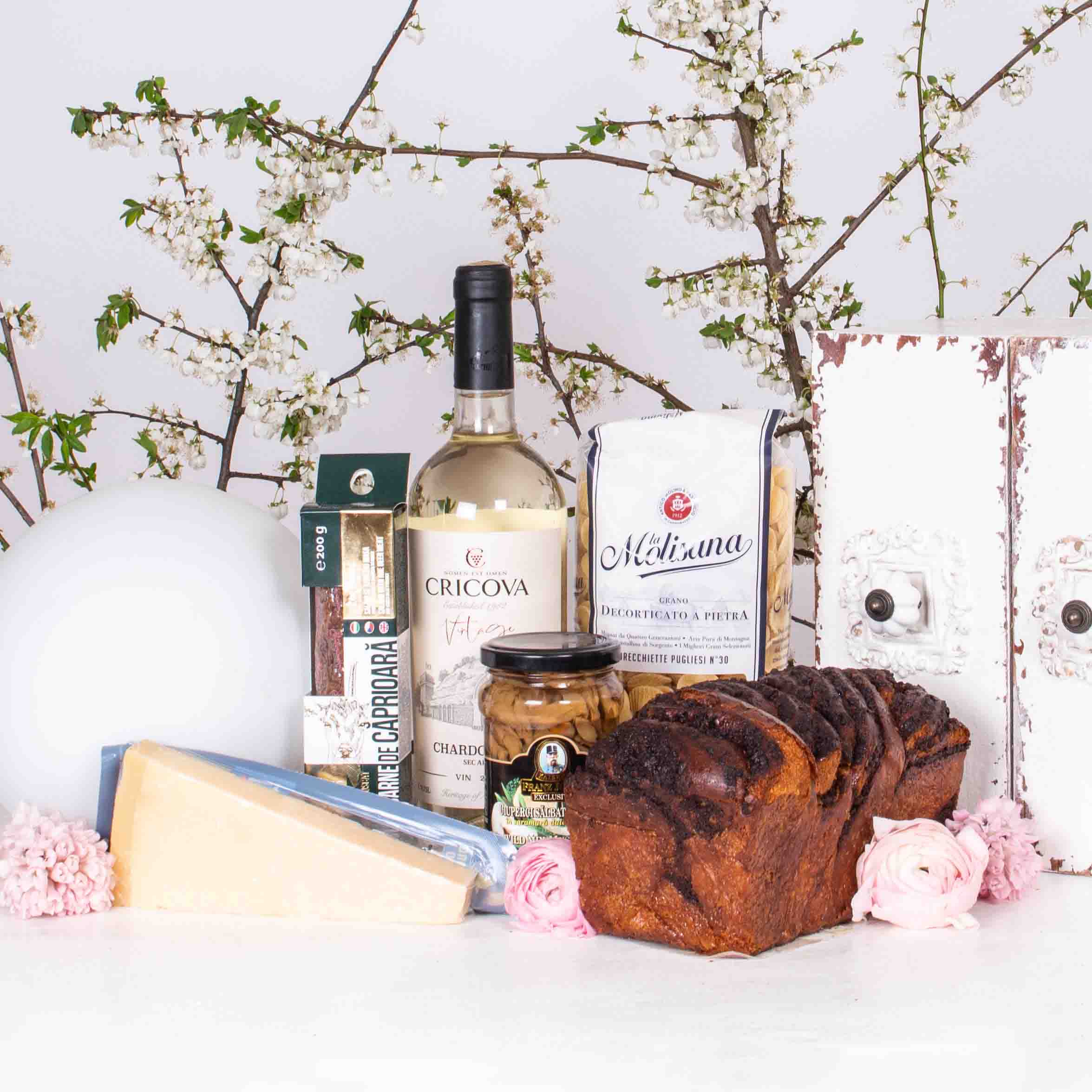 Gift with parmigiano reggiano zanetti cheese, venison salami, Franz Josef mushrooms, Molisana gnocchi pasta, cozonac with brandy syrup and cricova wine