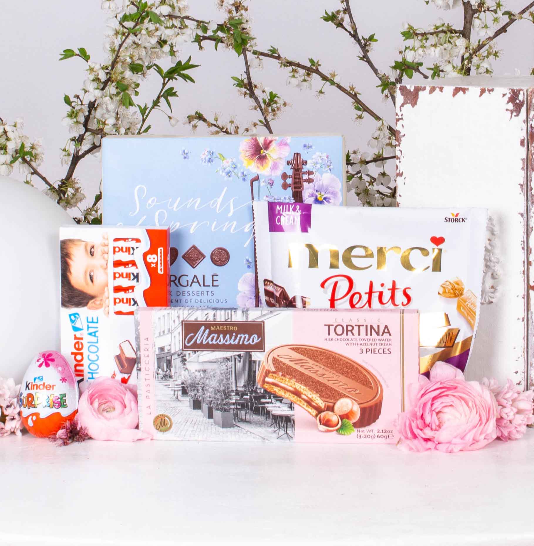 Gift with Kinder egg, Kinder chocolate, Pergale candies with milk chocolate, Merci Petits candies, Massimo wafer