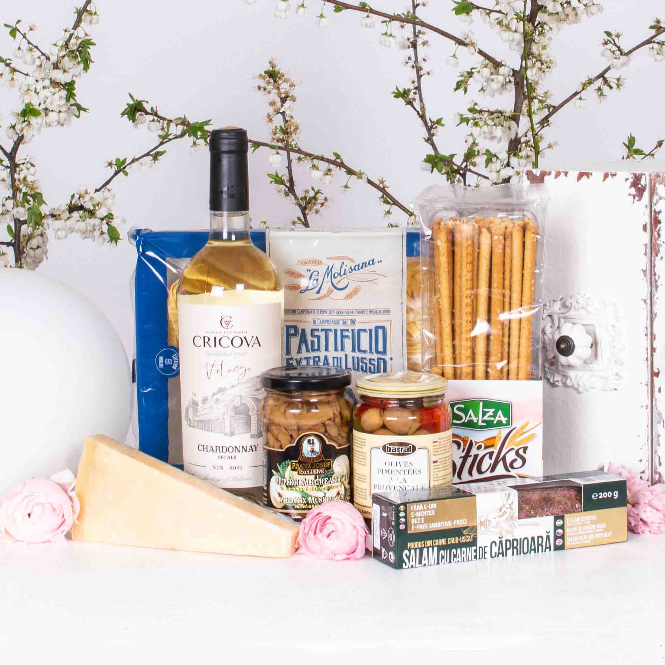 Gift with parmigiano reggiano zanetti cheese, Molisana tagliatelle pasta, Franz Josef mushrooms, barral olives, venison salami, breadsticks with Salza salt and cricova wine