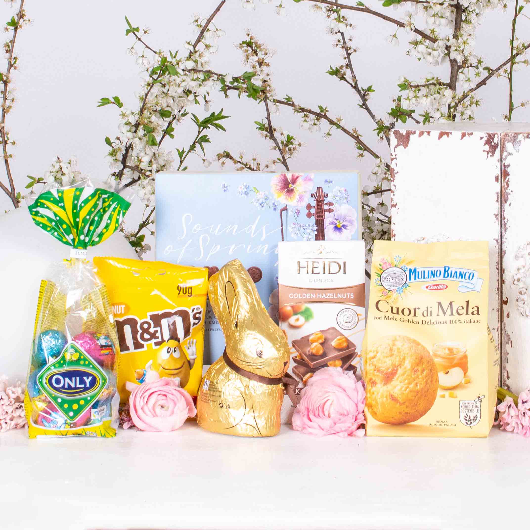 Gift with M&M candies, chocolate pasta eggs, chocolate rabbit, Heidi chocolate, milk chocolate Pergale candies, Mullino Bianco honey biscuits