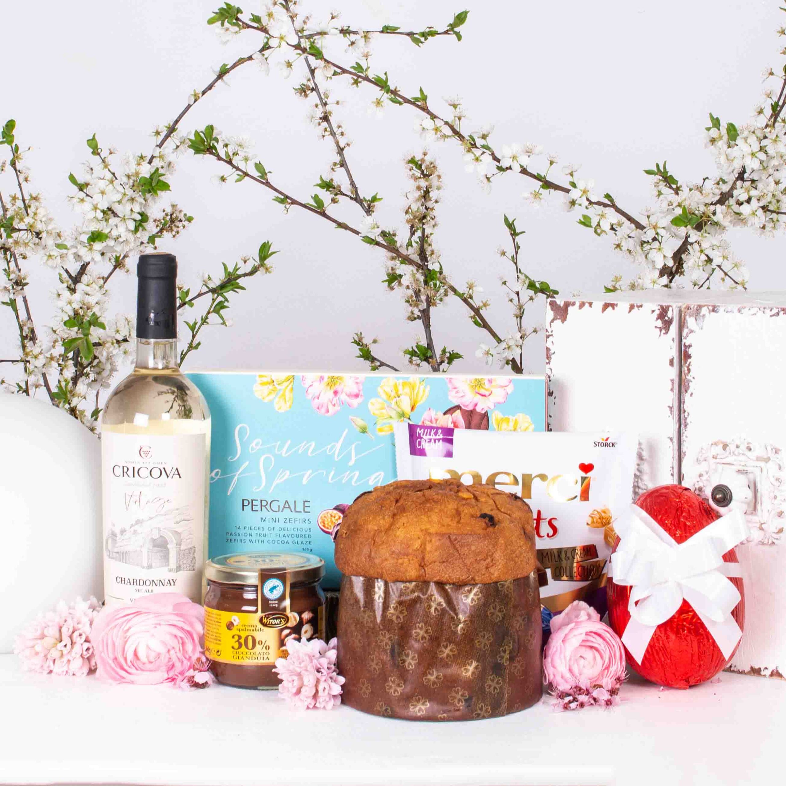 Easter gift baskets with traditional Easter cake with sweet cheese and raisins, Romanian traditional cozonac with Brandy syrup from Zexe Braserie (finger licking good, we promise!) , Pergale pralines with chocolate and milk, Pergale pralines with passion fruit, M & M’s Dragees with Chocolate, Roshen Chocolate Wafers, Ferrero Rocher Chocolate Candies , Witor Dark Chocolate Spread Cream, Milk Chocolate Eggs, Kinder Surprise Eggs, Kinder Chocolate, Knoppers Wafers , Assorted Merci Pralines, Reggiano Zanetti Parmesan , Franz Josef Balsamic Vinegar, Silvania Gourmet Raw-dried deer delicacy , Fuet Espetec Raw-dried Catalan specialty , Well-chosen pasta and sauces, Cricova Vintage Cabernet red dry wine – Sauvignon, Cricova Vintage white dry wine – Chardonnay and Moet Champagne are the most appreciated.
