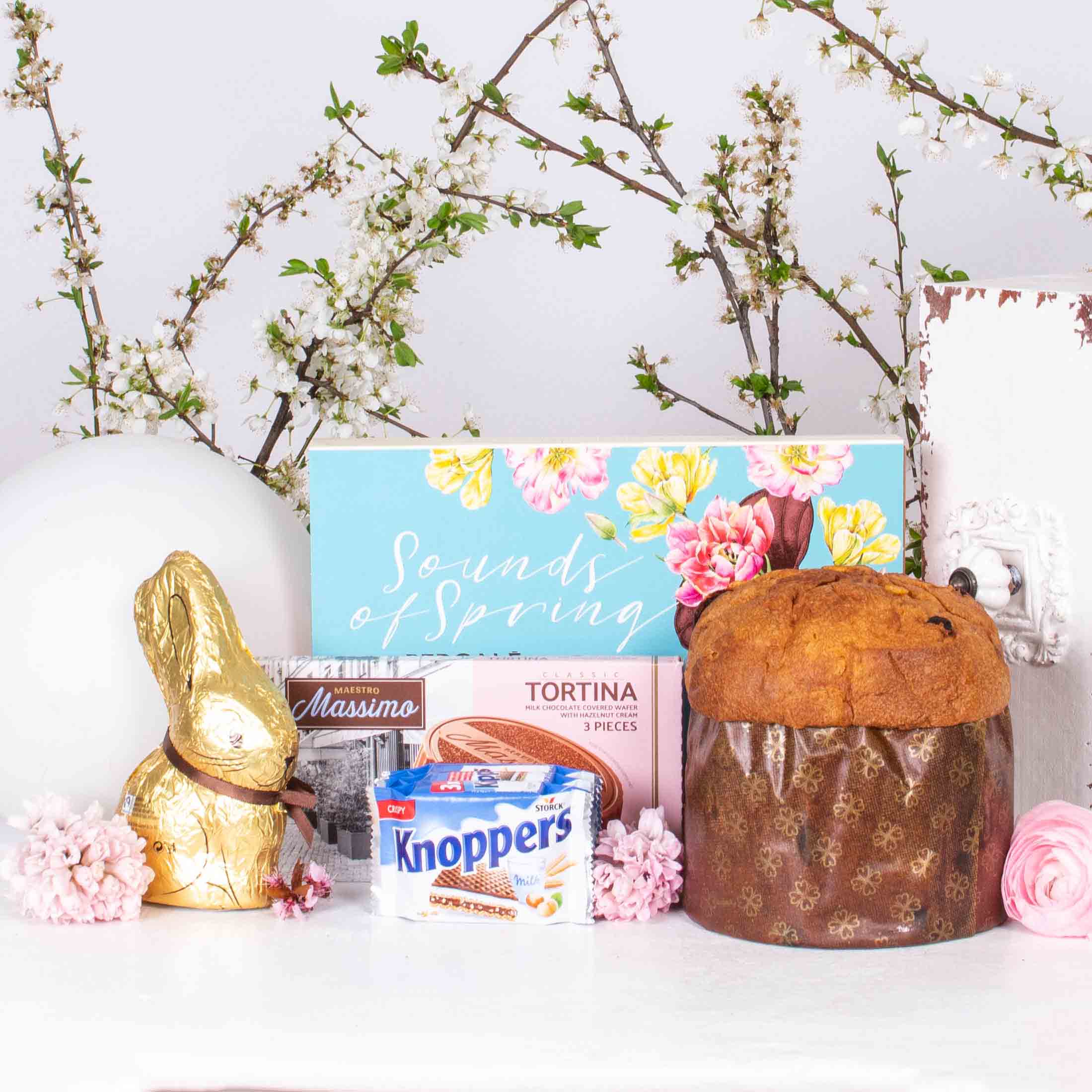 Gift with Chocolate bunny, Massimo wafer, Knoppers wafer, Pergale passion fruit candies and Gran Ducale panettone
