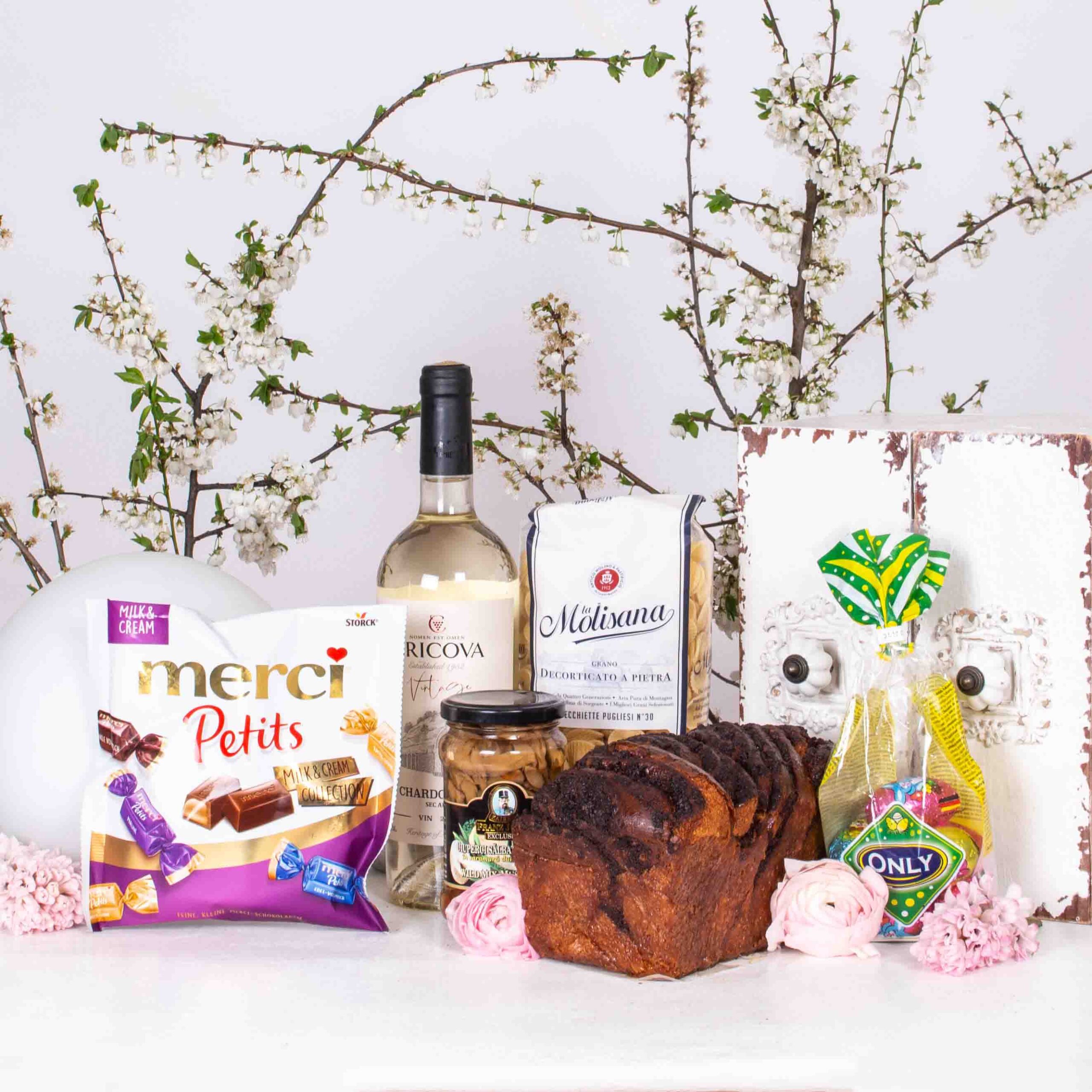Gift with Merci Petits candies, chocolate eggs, cozonac with brandy syrup, Franz Josef mushrooms, Molisana gnocchi pasta and cricova wine
