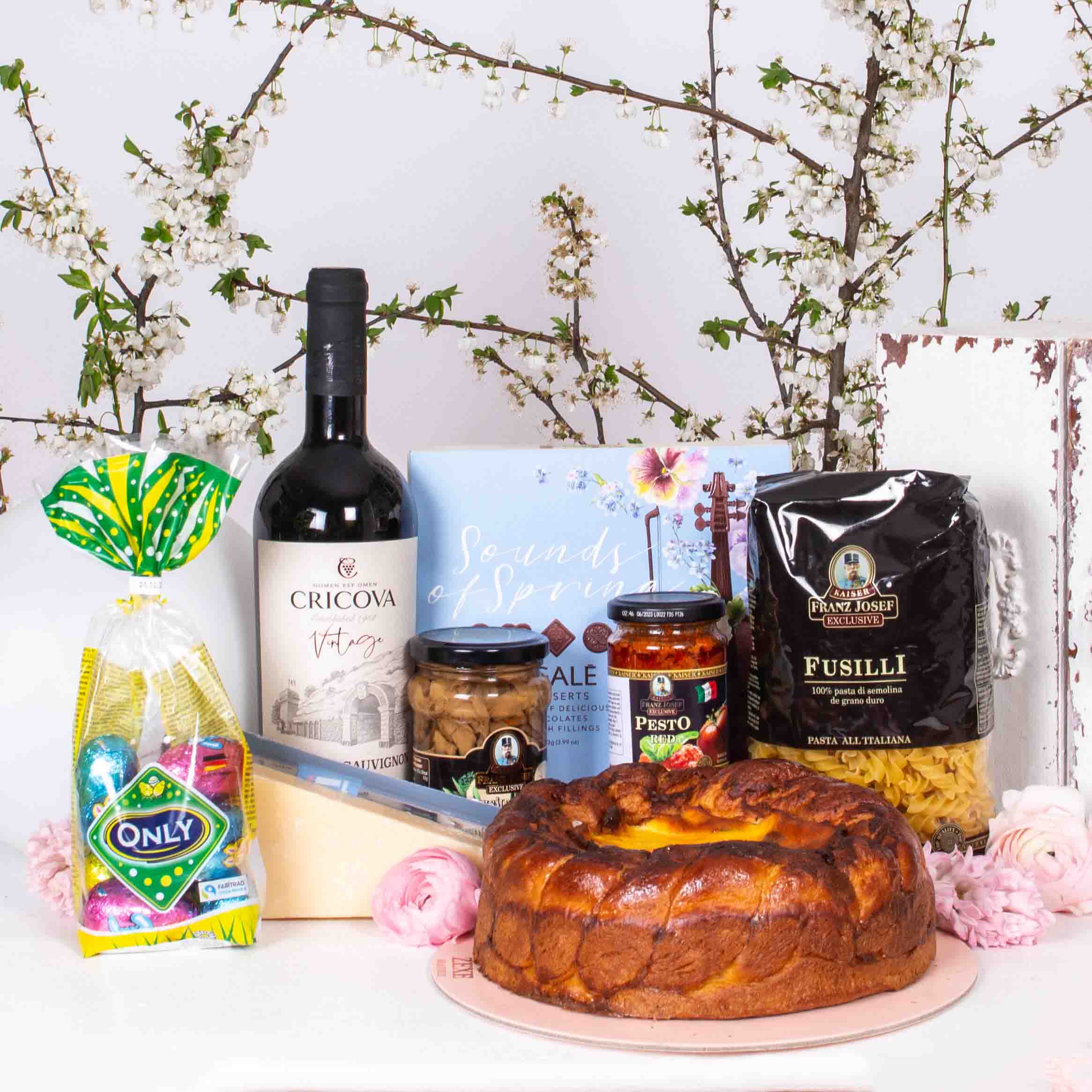 The most special occasions need appropriate gifts. And Easter will always remind us of Egg hunting and gifts. Order this Easter gift with traditional Romanian easter cake with sweet cheese and raisins and wine and turn a normal day into a memorable one. Gourmet Easter gifts are perfect when we want to make a beautiful surprise for both our loved ones and business partners.
