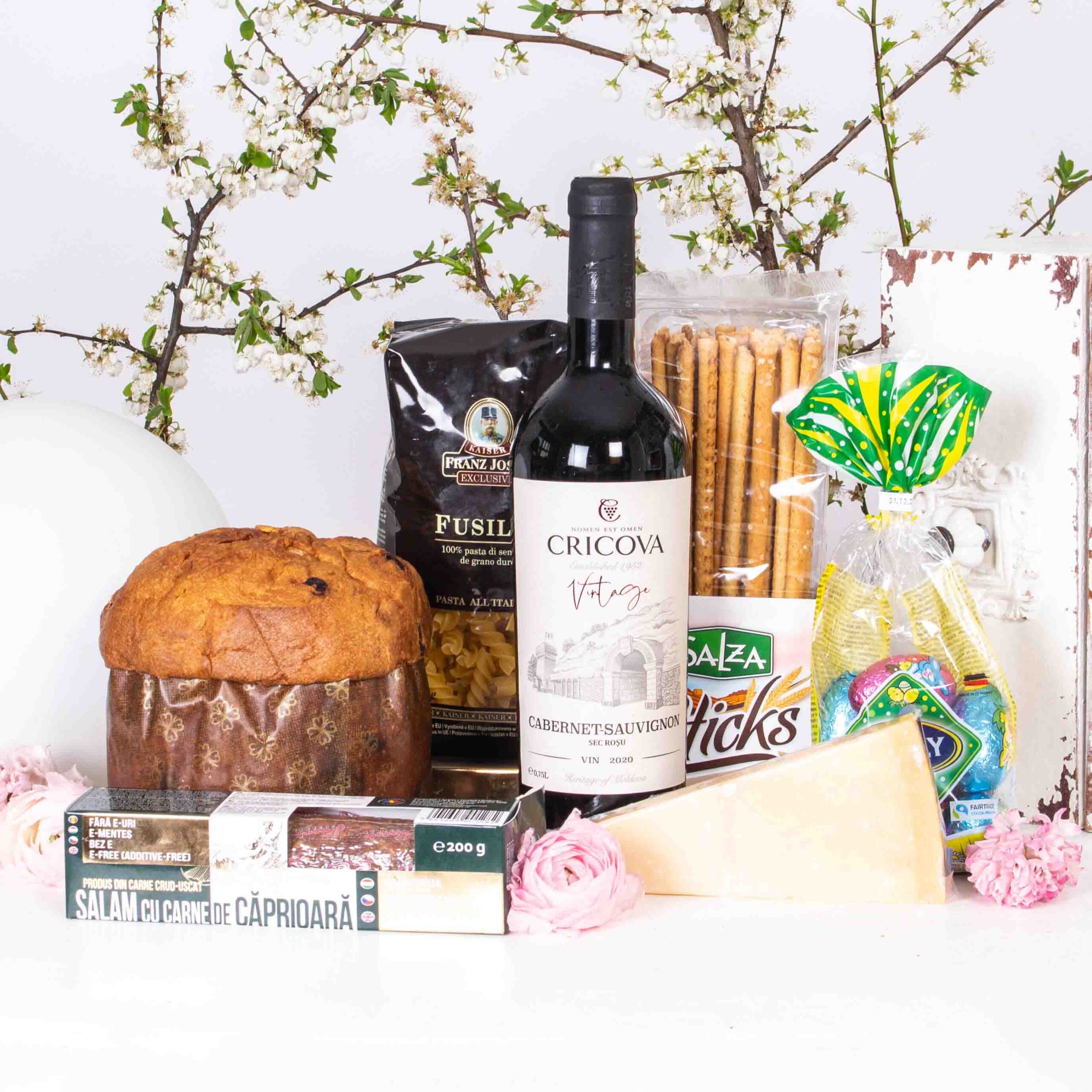Gift with venison salami, parmigiano reggiano zanetti cheese, fusilli Franz Josef pasta, breadsticks with Salza salt, panettone gran ducale, pasta eggs and cricova wine