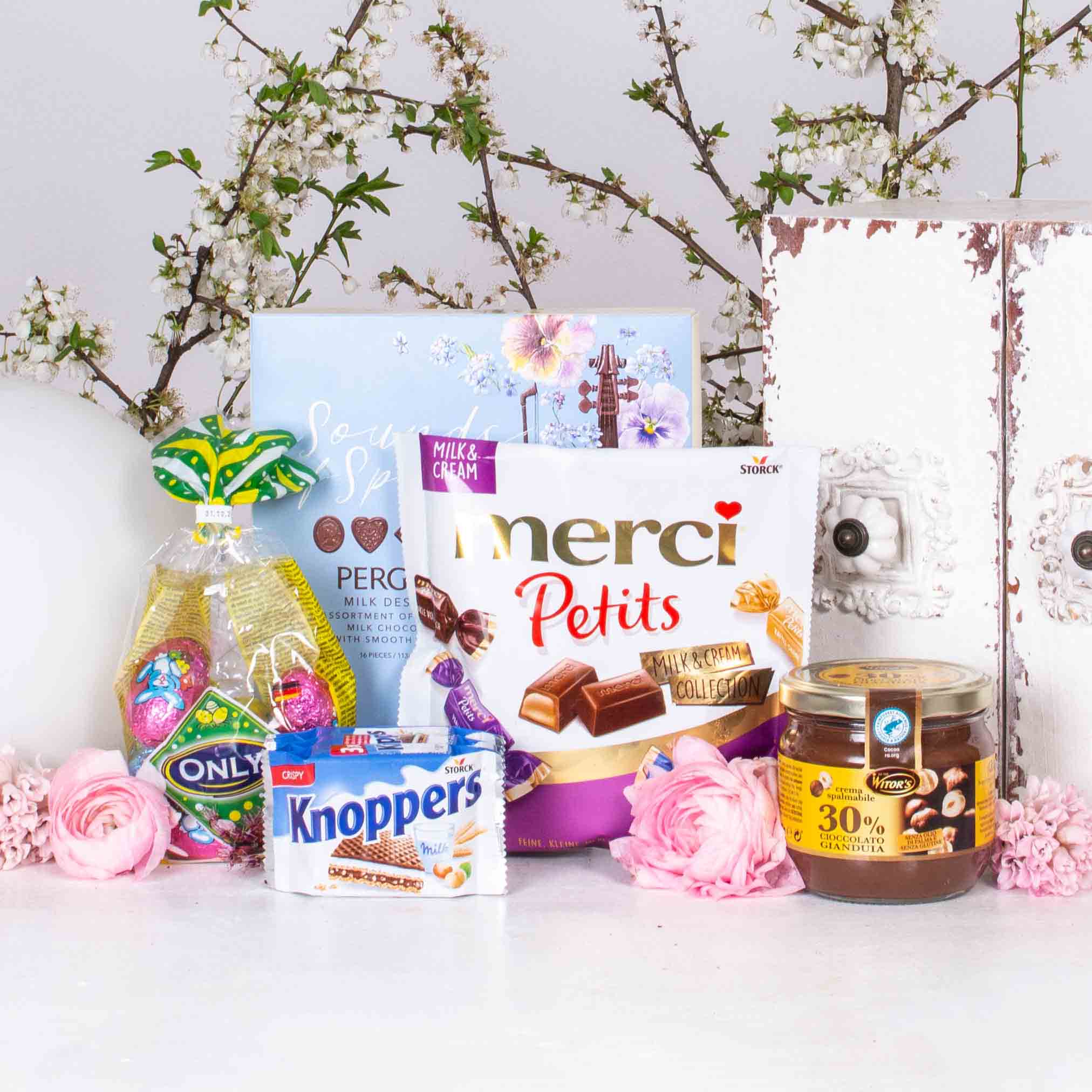 Gift with knoppers wafer, chocolate eggs, Pergale candies with milk chocolate, Merci Petits candies, chocolate cream