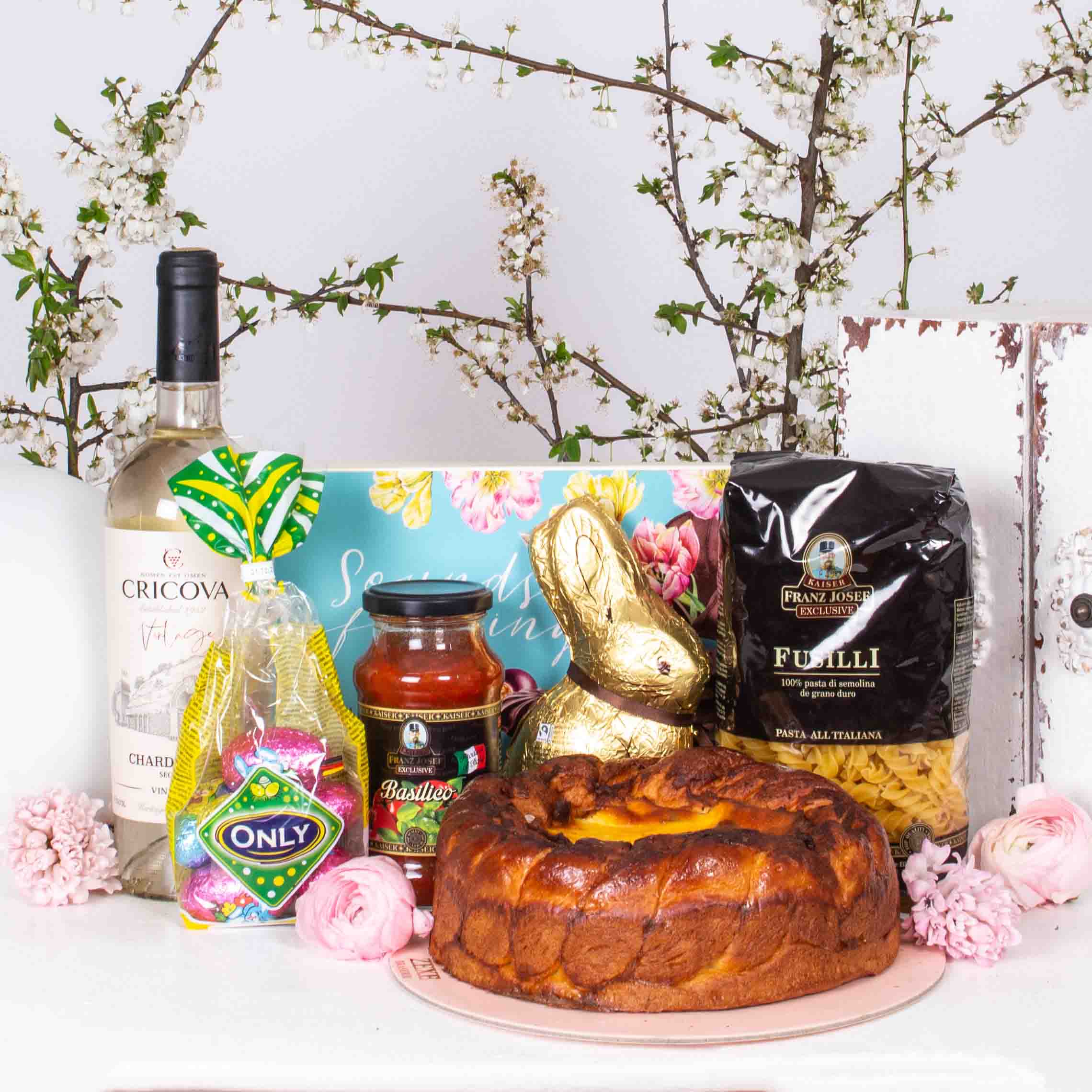 Gift with chocolate bunny, Easter eggs, traditional Romanian easter cake with sweet cheese and raisins, Pergale candy with passion fruit, Franz Josef fusilli pasta, Franz Josef basilico sauce and cricova wine