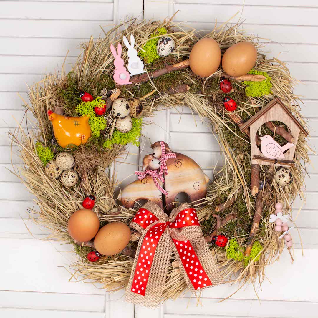Holidays bring us together with our beloved ones. This Easter wreath arrangement with eggs as well as all the other Easter arrangements with bunnies, hens, eggs, mushrooms and others will be the center of attention wherever you place them. We have done arrangements with red eggs and with all kind of beautiful Easter decorations and figurines, special gourmet gifts and baskets for the red eggs. These arrangements will look amazing at your office, at home or will decorate the Easter table. An Easter arrangement is the most beautiful gift for friends and family.