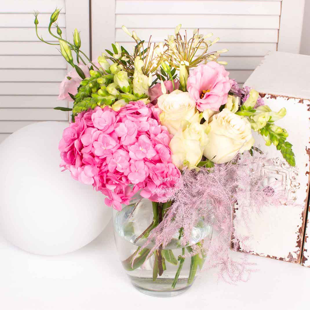Flowers bring happiness to the people. This Bouquet of hydrangea and roses will be a beautiful surprise to anyone. For sure this bouquet made by our florists at the Purple Flowers online Flower Shop can transform a regular day into a memorable one. Add your special message to the flowers and we will deliver it as soon as possible. There is no better way of saying „I love you!”, „Happy Birthday!” or „Congratulations!” than with a bouquet of flowers.