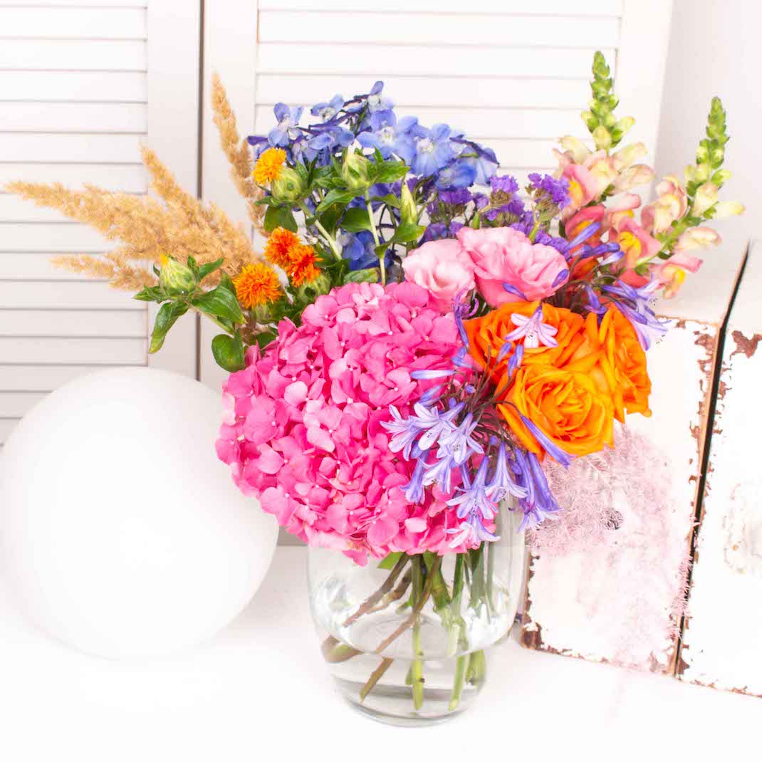 Glass vase and bouquet with pink hydrangea, 3 orange roses, pink lisianthus, 2 agapanthus, greenery and other flowers