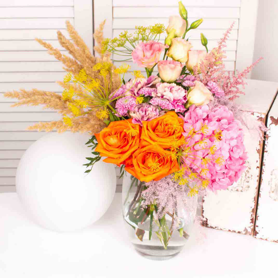 Glass vase and bouquet with 3 orange roses, pink hydrangea, pink lisianthus, greenery and other flowers