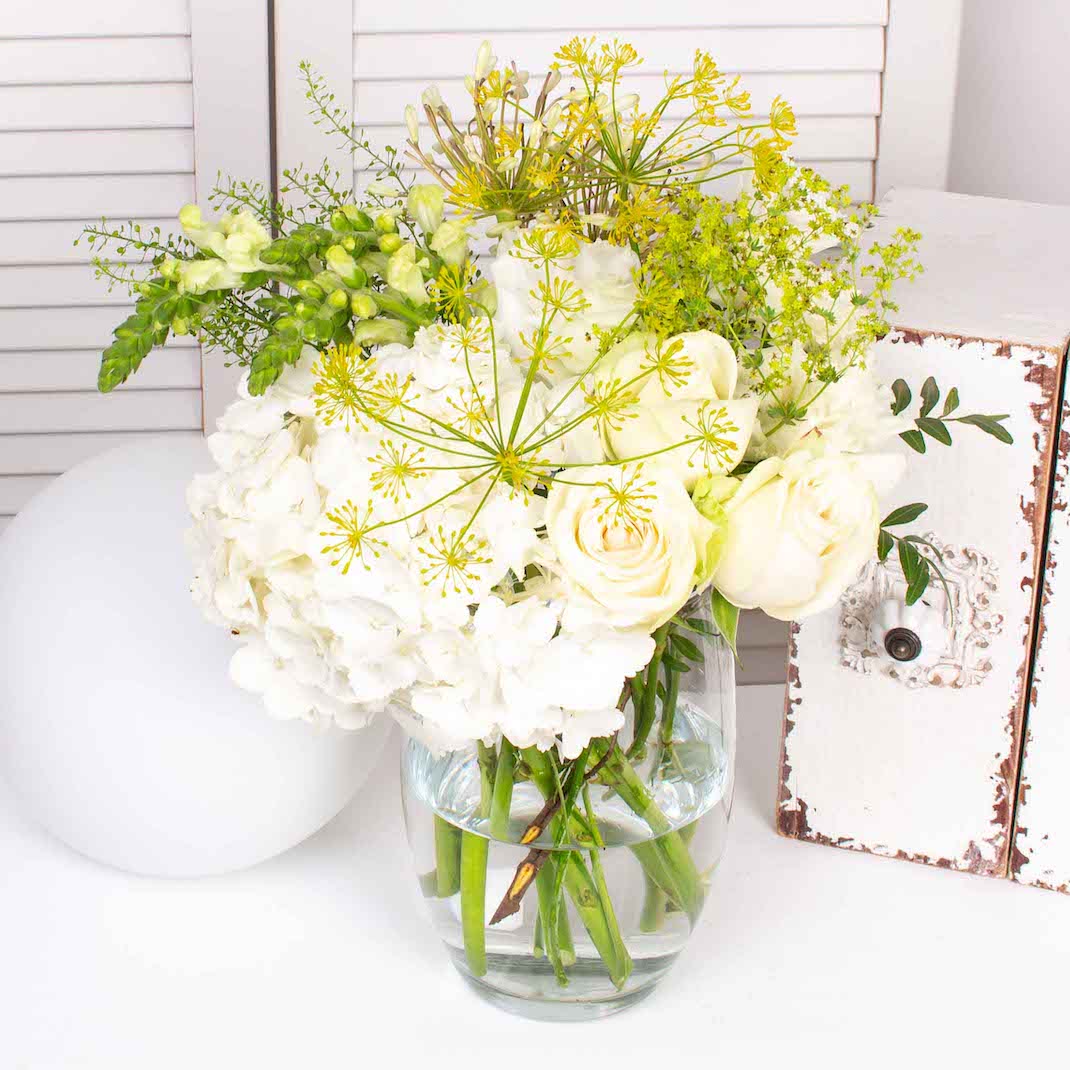 Glass vase and bouquet with white hydrangea, white lisianthus, 3 white roses, greenery and other flowers