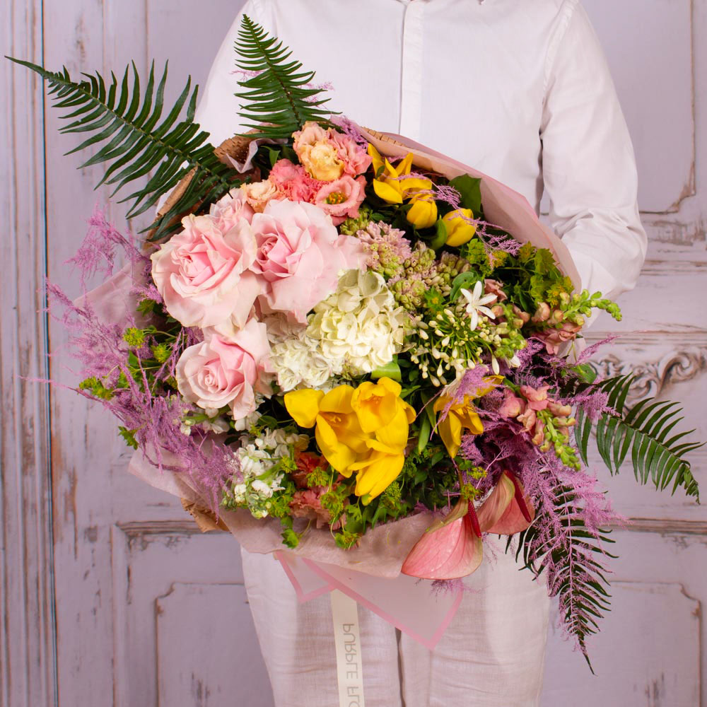 Bouquet with white hydrangea, 3 pink roses, 6 yellow tulips, 2 pink lisianthus, 3 pink hyacinths, greenery and other decorative flowers.