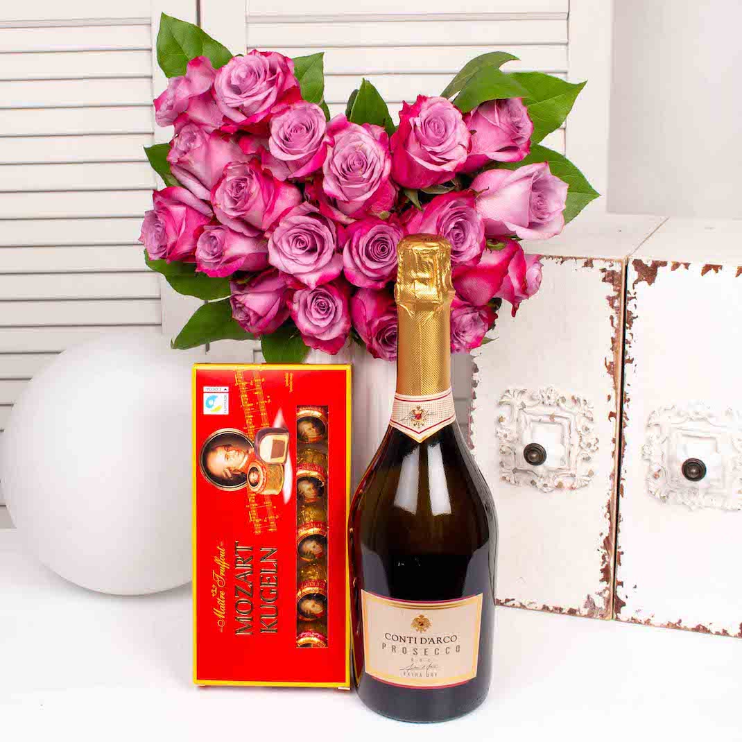 19 pink roses bouquet with decoration greenery, prosecco conti darco 750ml and chocolate praline with marzipan Mozart Kugeln
