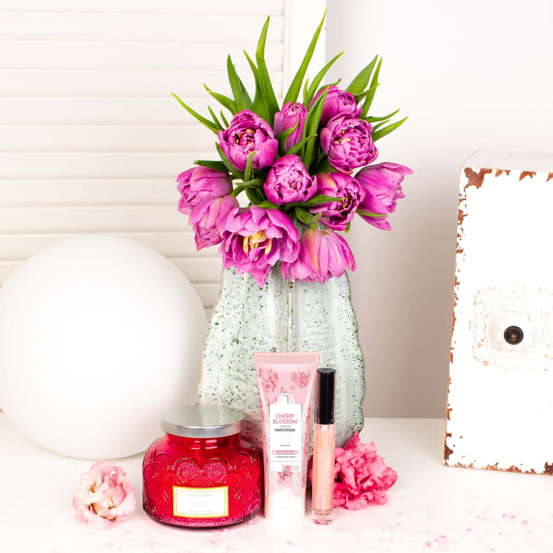 The most special occasions need special gifts. Order this gift with tulips, lip gloss, hand cream, candle and turn an ordinary day into a beautiful memory. Designed specifically for women, whether you want to give it to your mother, girlfriend, colleagues, or other women you know, they will surely appreciate that you’ve thought of them.