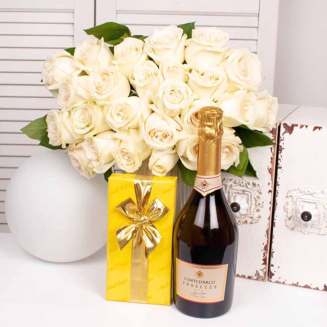 25 white roses bouquet with decoration greenery, prosecco conti darco 750ml and belgian chocolate praline